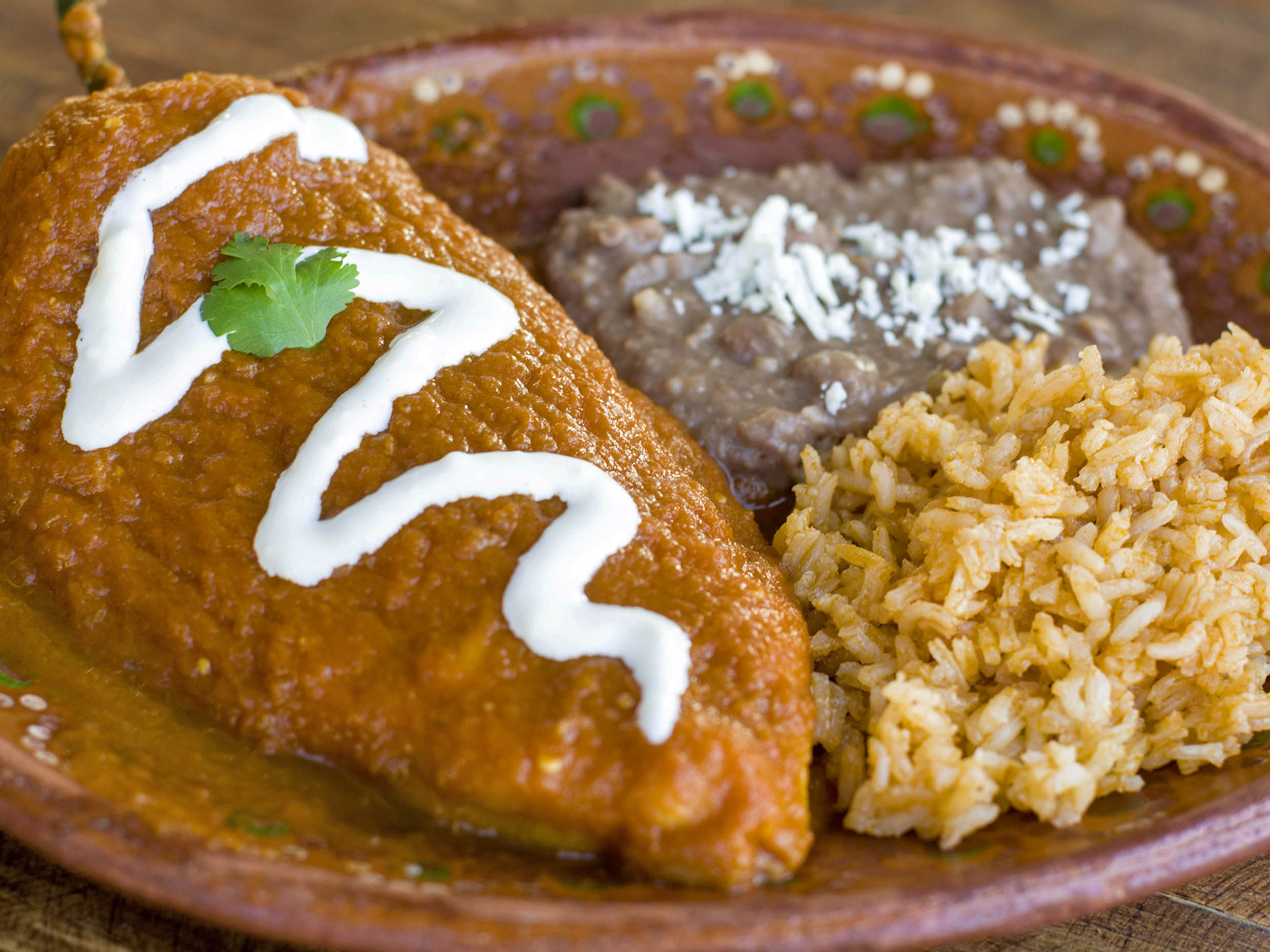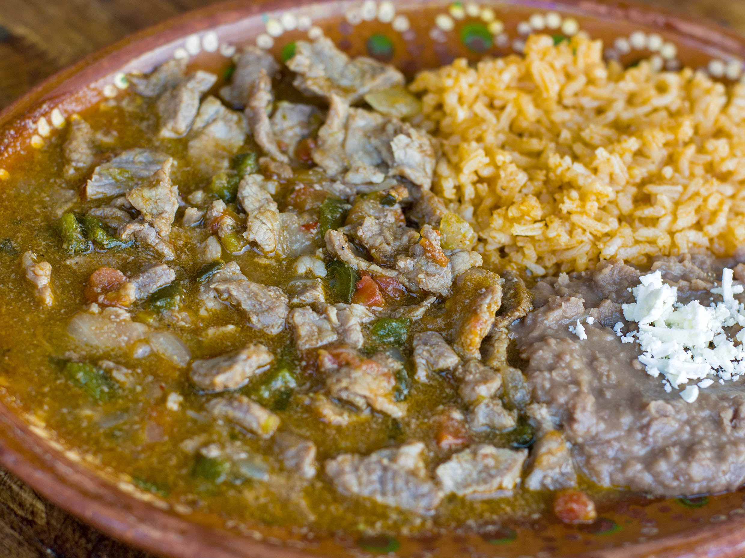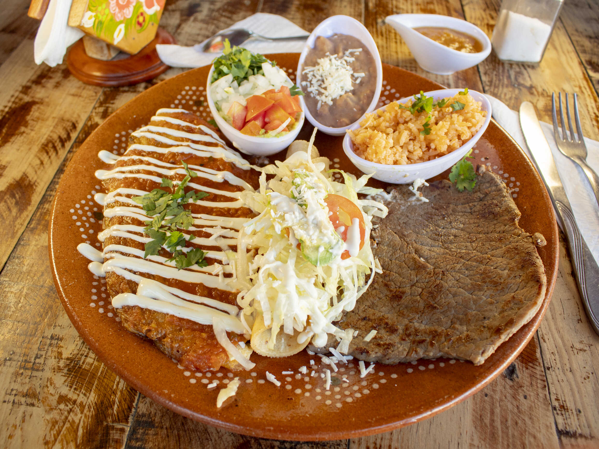 1 chile relleno, 1 flauta de pollo, un bistec asado de res, guarnición de guacamole, arroz y frijol (incluye tortillas y salsa picante).