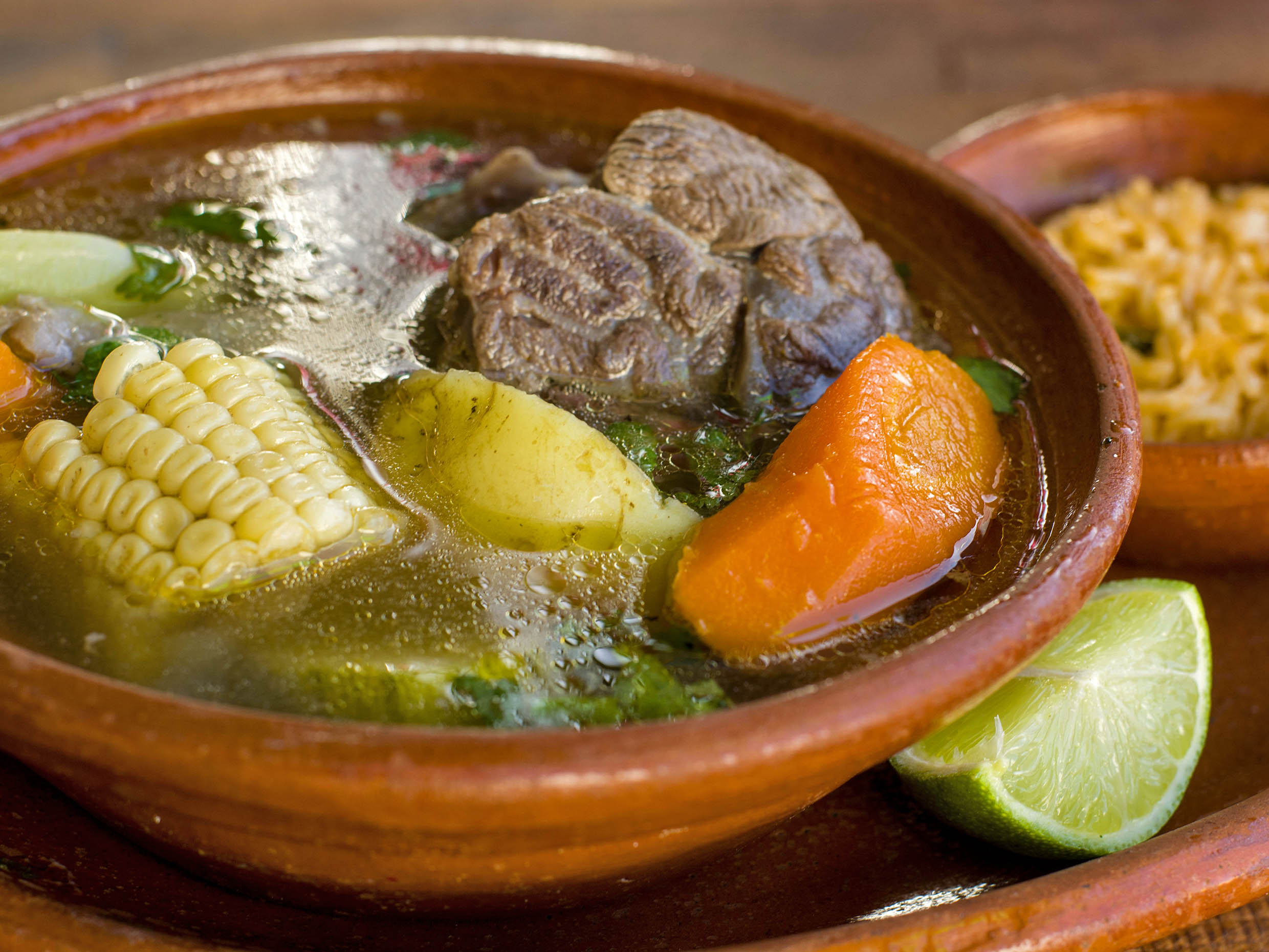 Clásico cocido de res con calabaza, elote, papa, zanahoria, chayote, carne de res y arroz aparte. (incluye tortillas de maíz y salsa picante aparte).