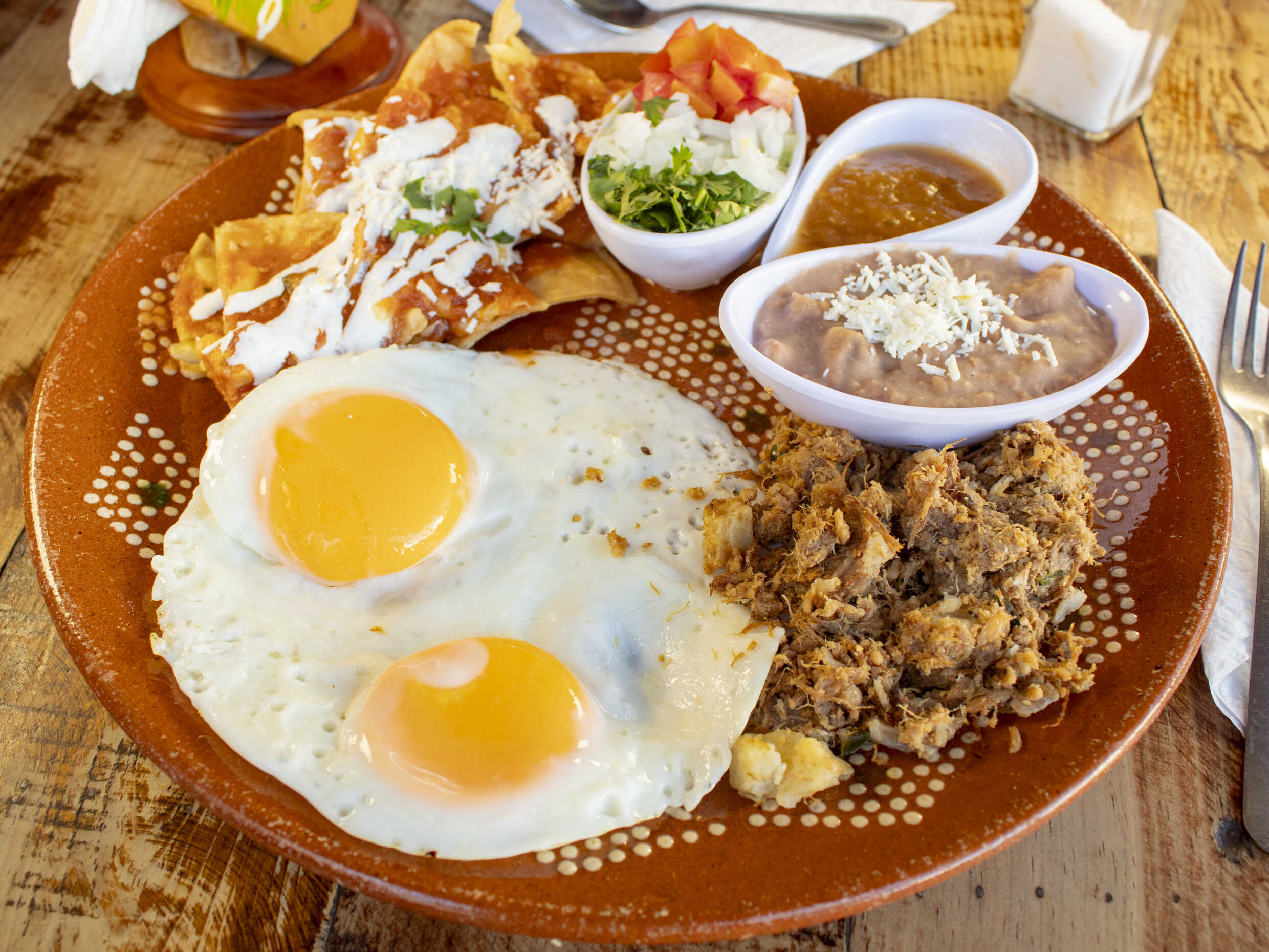 2 huevos estrellados o revueltos, chilaquiles rojos o verdes, machaca de res regional, frijol con queso cotija y guacamole (incluye tortillas y salsa picante).