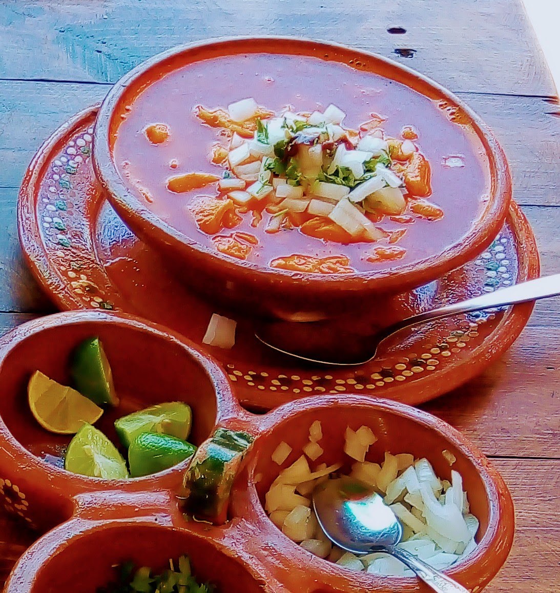 Con grano de maíz pozolero, acompañado de cebolla, cilantro, limón y tortillas de maíz o pan a su elección (incluye salsa de chile de árbol).
