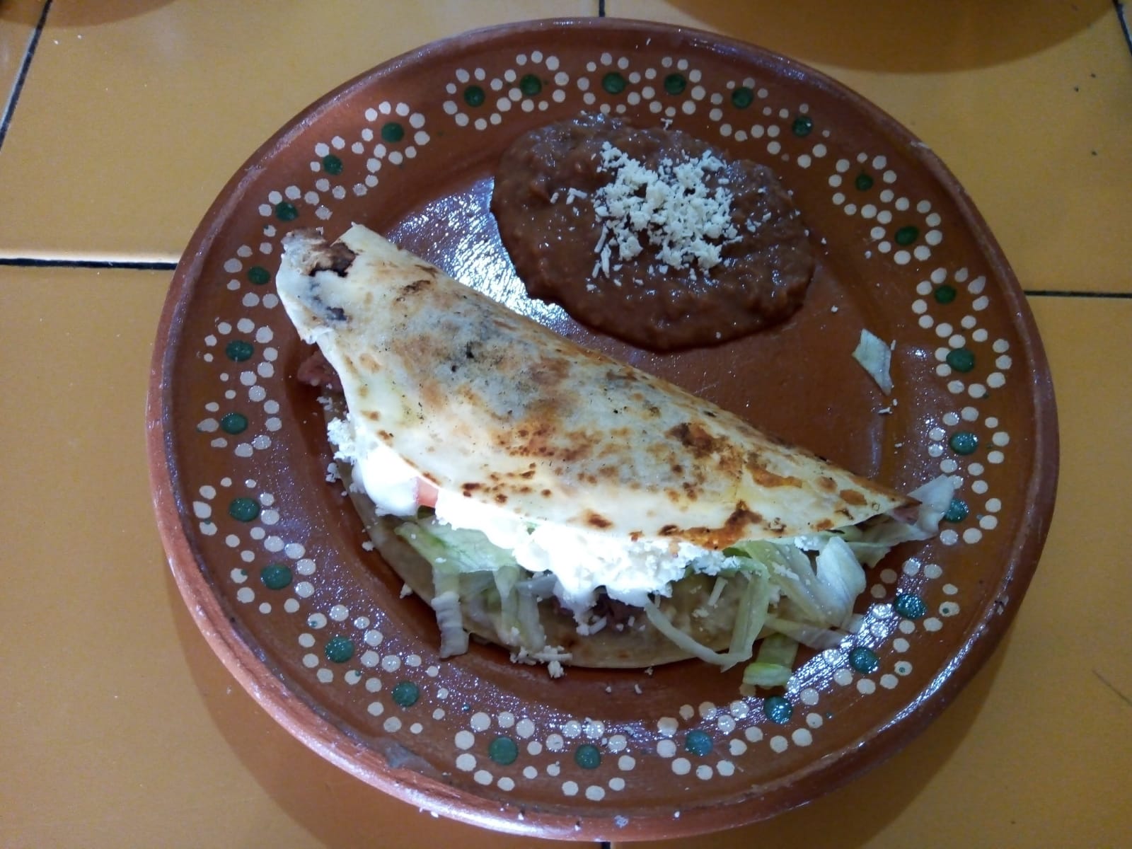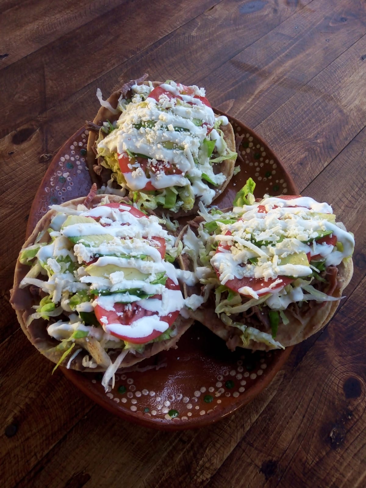 1 pieza de sope hecho a mano, base de frijol, con deshebrada de res o pollo, lechuga, tomate, aguacate, crema y queso cotija.