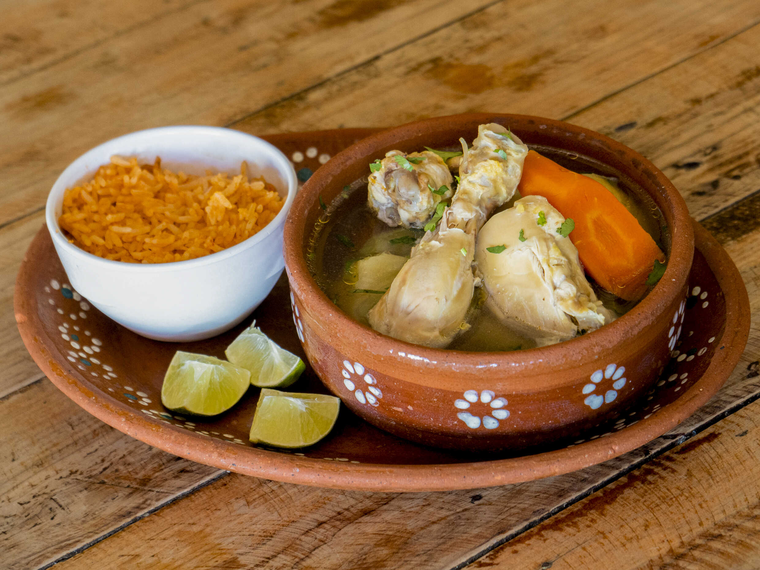 Clásico caldo de pollo con zanahoria, papa, calabaza, pollo y arroz aparte (incluye tortillas de maíz y salsa picante aparte).