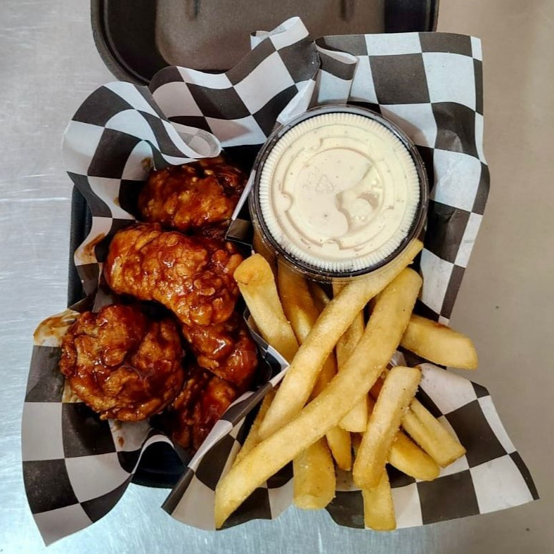 300 gr de boneless o 10 alitas, acompañados de 150 gr de papas a la francesa, más pepino, zanahoria, 1 aderezo ranch, catsup y mostaza.