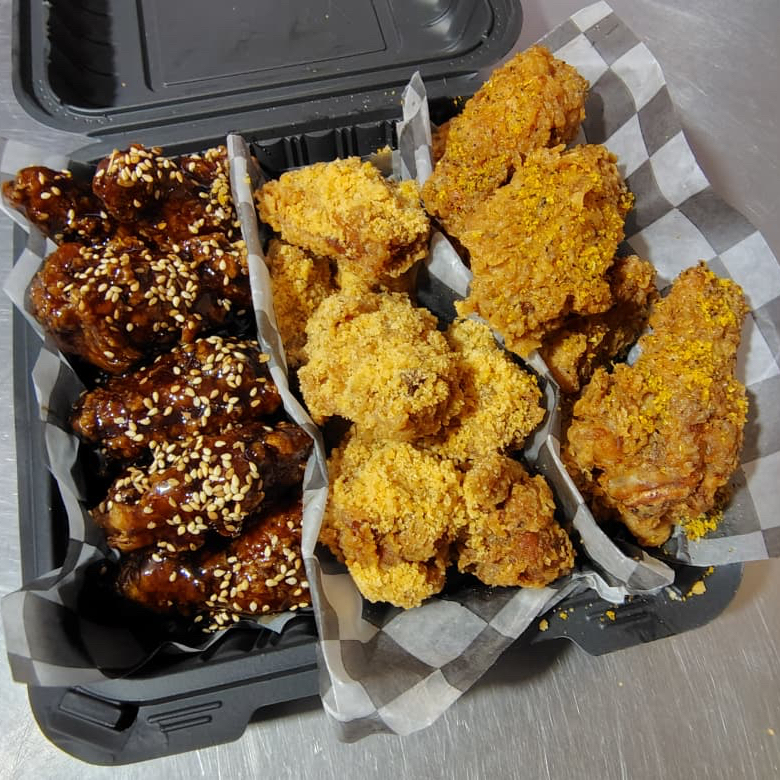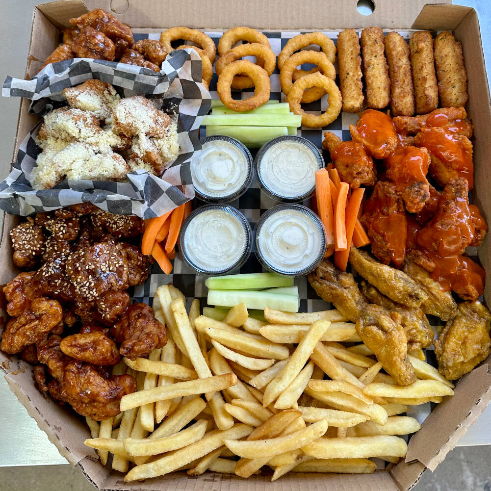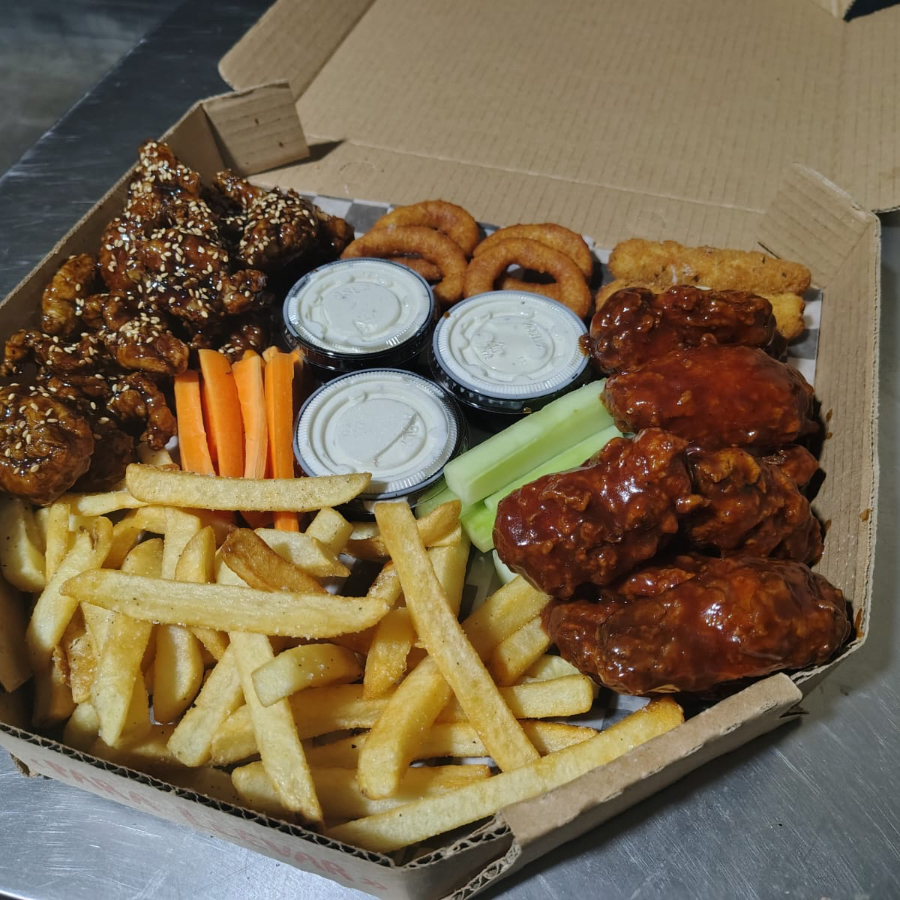 10 alitas, 300 gr boneless, 250 gr de papas a la francesa, 4 aros de cebolla, 2 dedos de queso y 3 aderezos ranch. Todo acompañado de pepino y zanahoria.