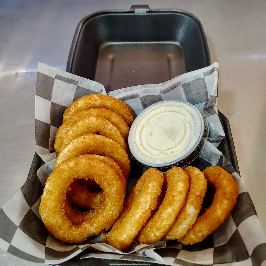 10 pz aros de cebolla acompañadas de 1 aderezo ranch
