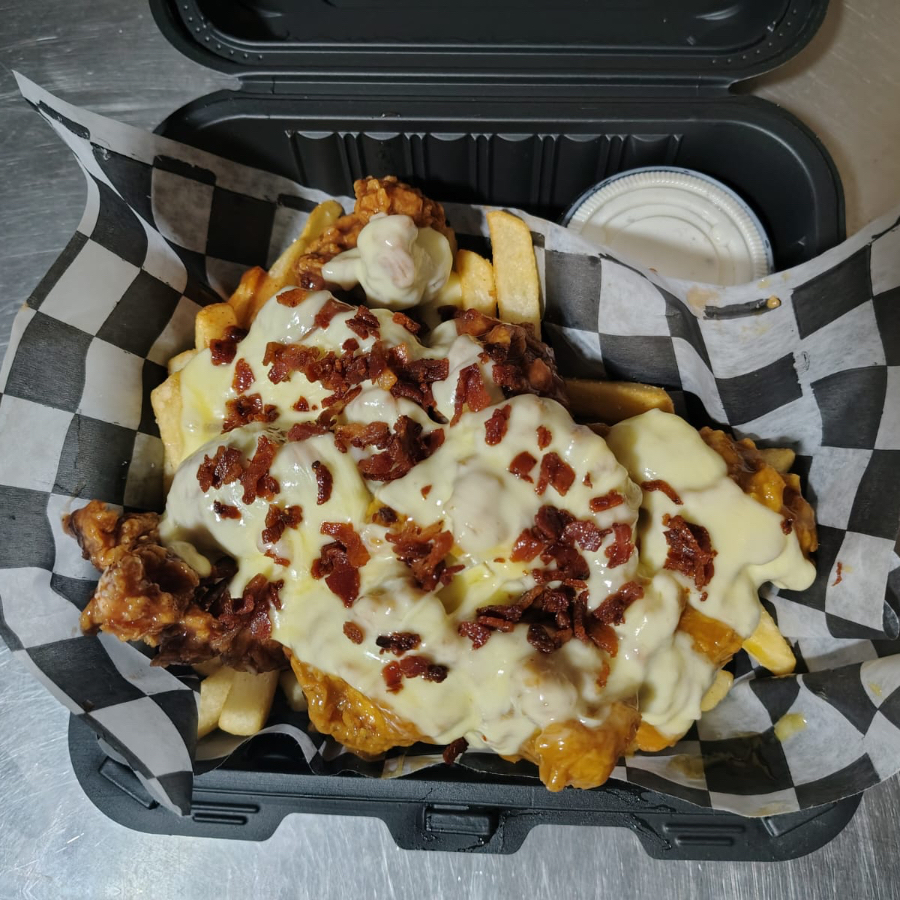 300 gr de boneless sobre una cama de 300 gr de papas a la francesa, con queso gouda gratinado y tocino, acompañado de 1 aderezo ranch.