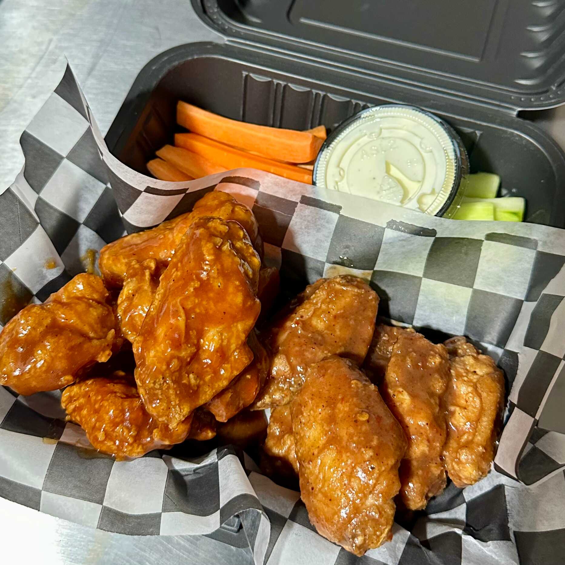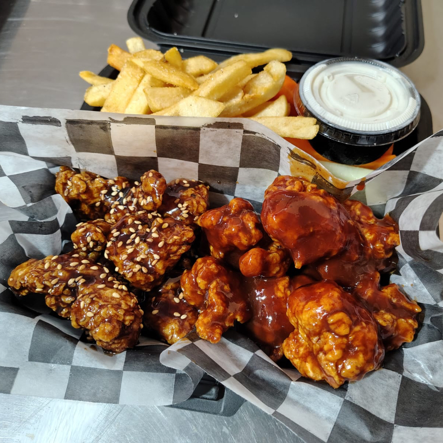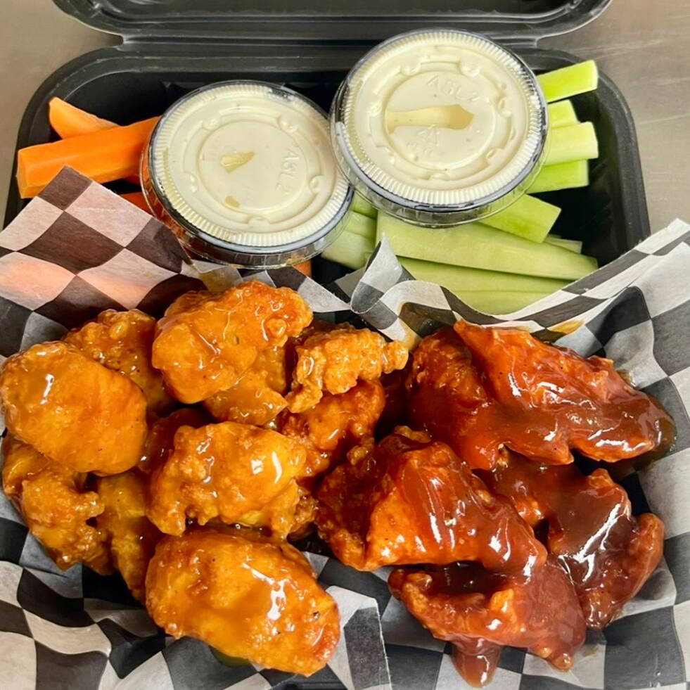 500 gr de boneless bañados en tu salsa favorita, acompañado de vegetales (Pepino y zanahoria) y 1 aderezo ranch.