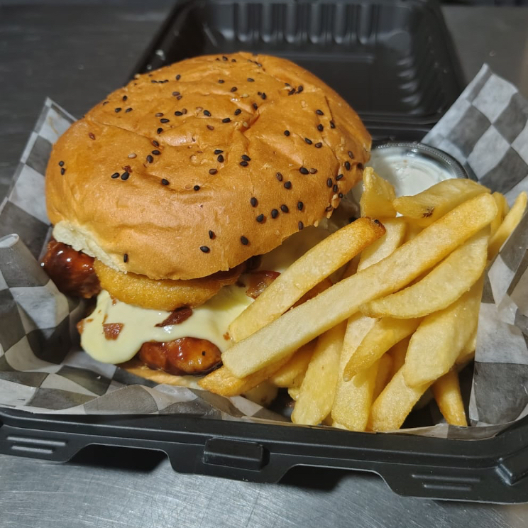 200 gr de boneless bañados en tu salsa favorita, queso gratinado, 2 aros de cebolla y crujiente tocino dentro de la hamburguesa, acompañada de 150 gr de papas a la francesa, 1 ranch, catsup y mostaza