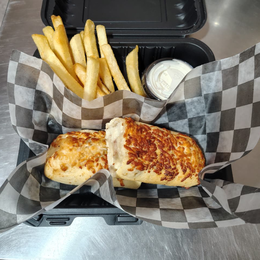 Delicioso pan horneado de 20 cm relleno de pechuga de pollo, queso y tocino, acompañado de un aderezo ranch y 150 gr de papas a la francesa.
