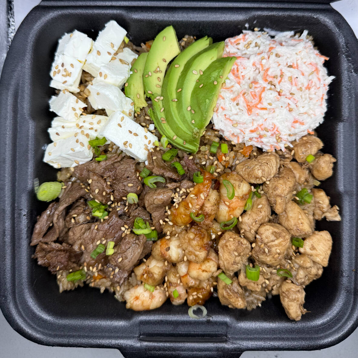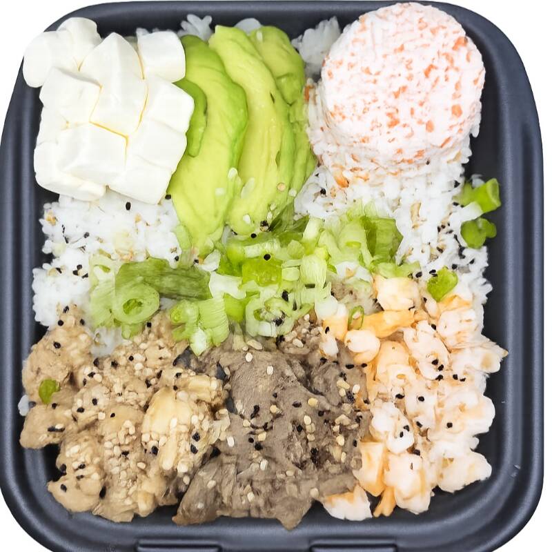 CAMA DE ARROZ YAKIMESHI, TAMPICO, AGUACATE, CEBOLLÍN, QUESO CREMA, AJONJOLÍ Y ACOMPAÑADO DE UNA IRRESISTIBLE COMBINACIÓN DE POLLO, RES Y CAMARÓN. IDEAL PARA QUIENES BUSCAN UNA TEXTURA MÁS CREMOSA Y LLENA DE SABOR.