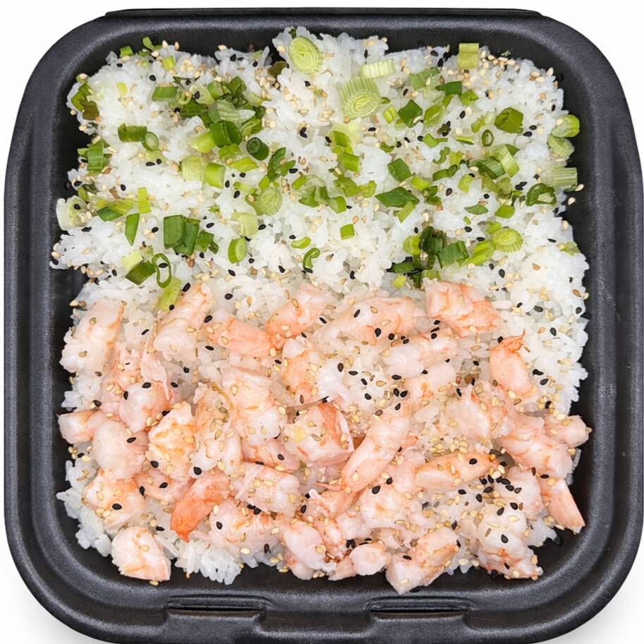 DELICIOSO TAZÓN DE ARROZ AL VAPOR, ACOMPAÑADO DE AJONJOLÍ, CEBOLLÍN Y SERVIDO CON EXQUISITOS Y JUGOSOS CAMARONES