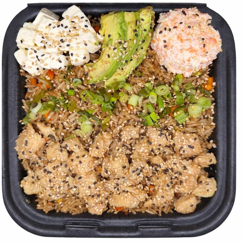 CAMA DE ARROZ YAKIMESHI, TAMPICO, AGUACATE, CEBOLLÍN, QUESO CREMA, AJONJOLÍ Y ACOMPAÑADO DE SUAVE Y JUGOSA PECHUGA DE POLLO. IDEAL PARA QUIENES BUSCAN UNA TEXTURA MÁS CREMOSA Y LLENA DE SABOR.