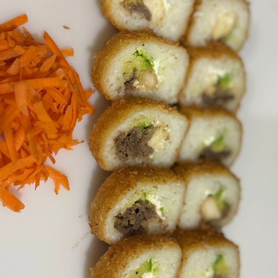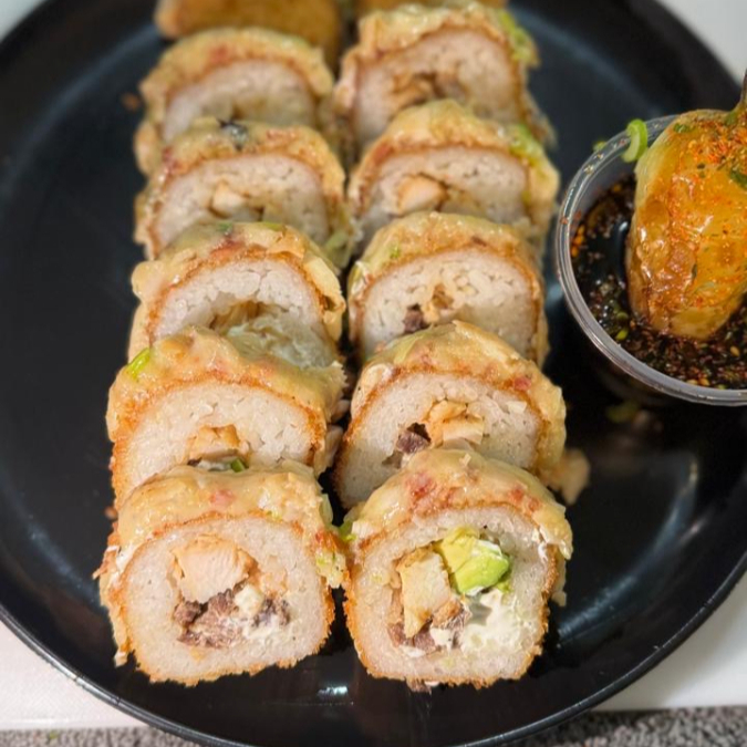 Camaron empanizado,filadelfia y aguacte por dentro) por fuera una mezcla de queso garatinado con chile toreado,res,tocino y cebolla caramelizada