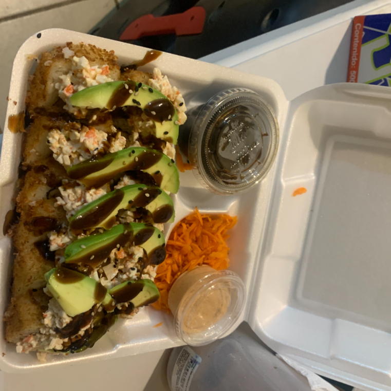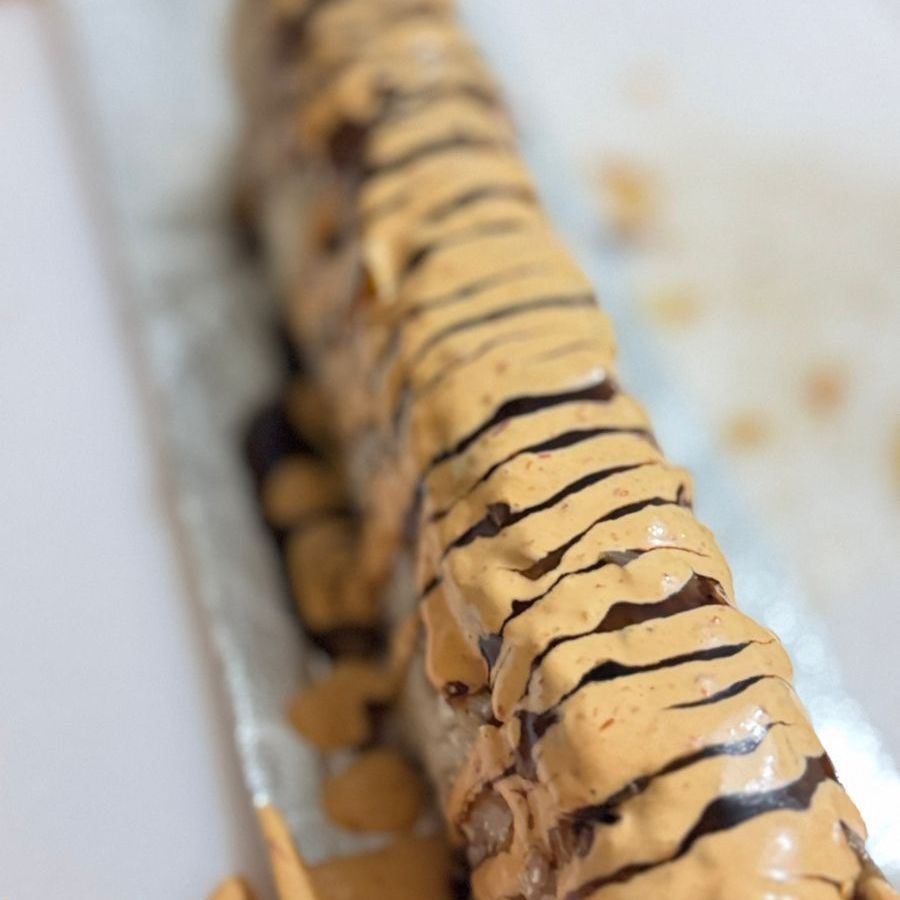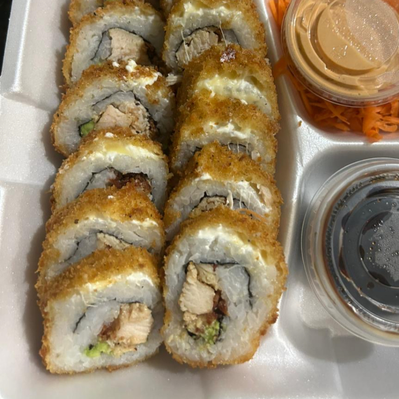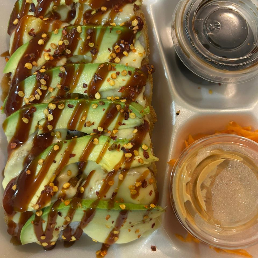 Aguacate,filadelfia y pollo por dentro) por fuera queso garatinado,laminas de aguacate,bañado en salsa bbq y chile quebrados