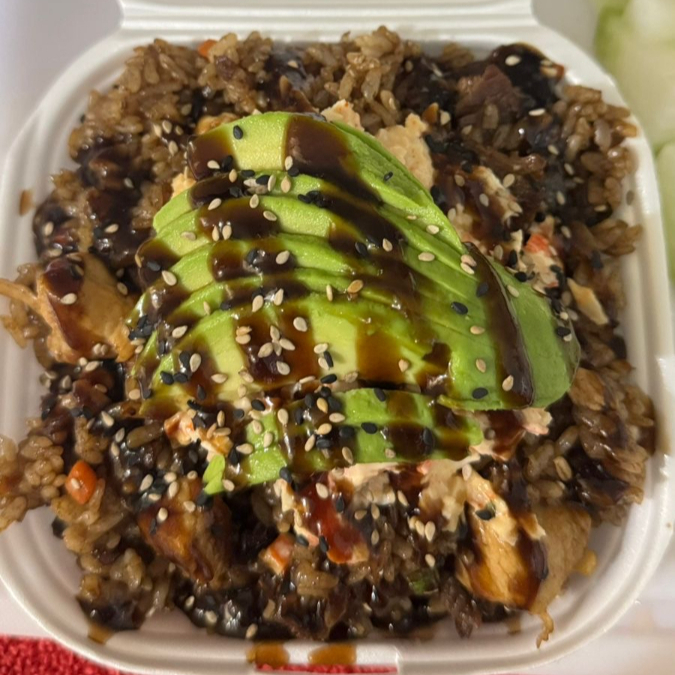 Arroz frito con verduras ,filadelfia, tampico, aguacate y furikake ) proteína res,pollo y camaron , bañado en salsa de anguila
