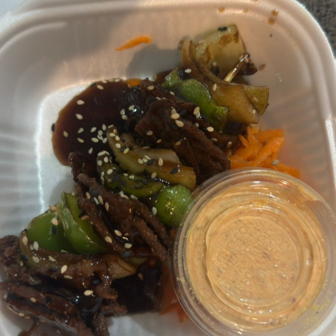 1 pz Res,cebolla y chile morron bañados en salsa teriyaki
