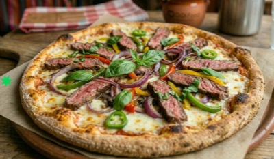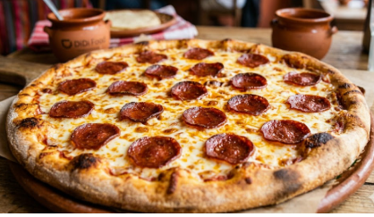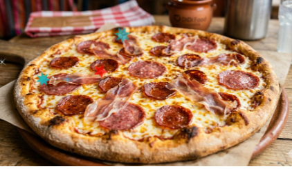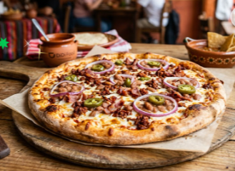 Queso Mozzarella, tocino, chorizo, jalapeño, cebolla morada, frijol