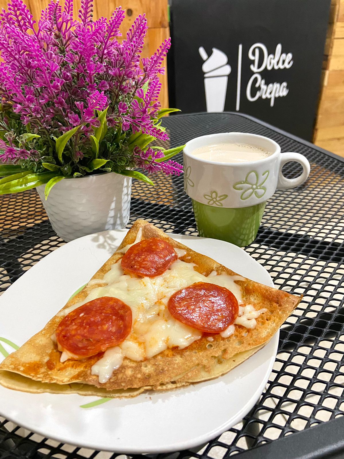 Crepa rellena de queso manchego, salsa de tomate y pepperoni