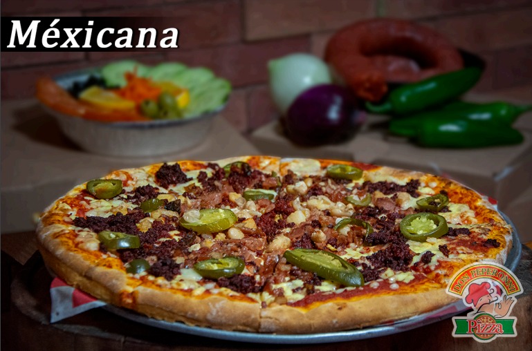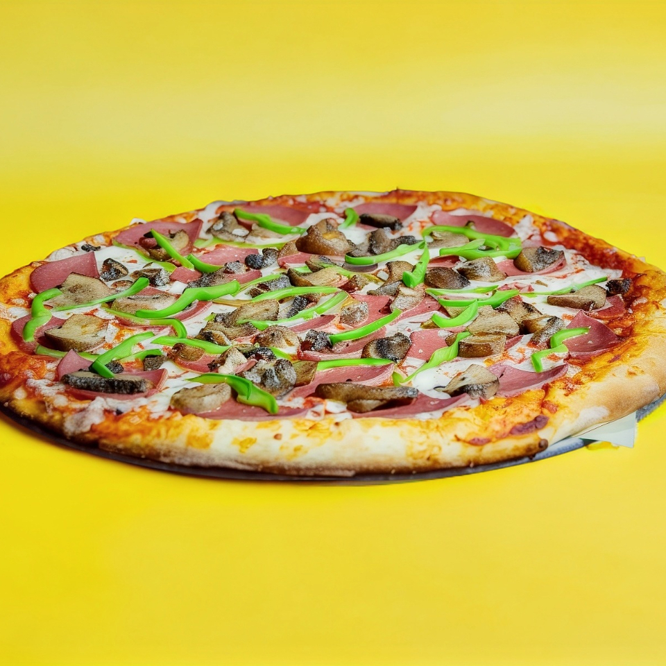 Pepperoni, champiñones, aceitunas negras y pimiento verde.