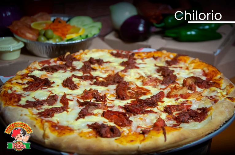 Jamon, salami, champiñones, chorizo, chilorio, salchicha, tocino y pimiento verde