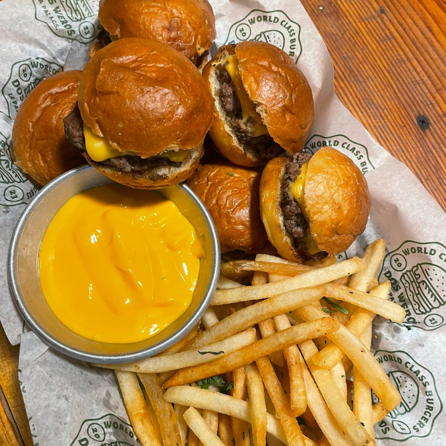 7 Mini hamburguesas acompañadas de papas a la francesa y queso para nachos.