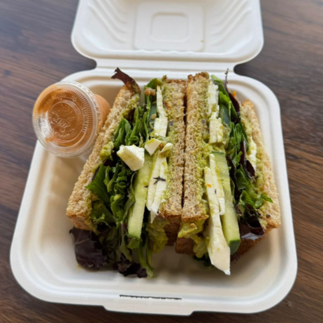 Pan ciabatta o clásico. Por dentro; aguacate, queso panela, pepino, tomate, mix de lechugas, espinacas y aceite de oliva. ¡Pruebalo con aderezo chipotle!