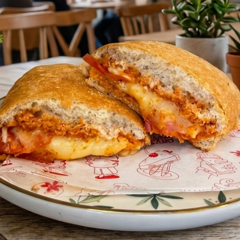Pan ciabatta al horno. Por dentro: salsa de tomate, queso gouda y pepperoni. Aperitivo ideal para acompañar con tu bebida favorita.