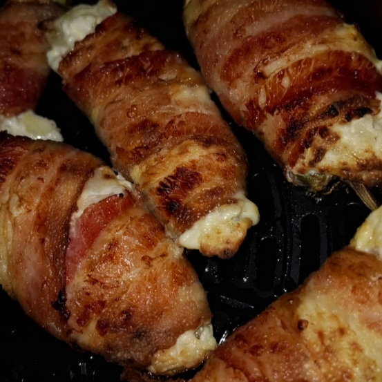 4 PZ Chile jalapeño rellenos de queso crema y envueltos en tocino.