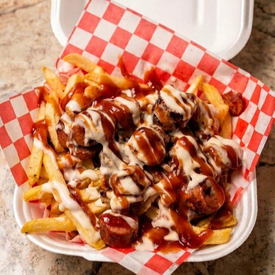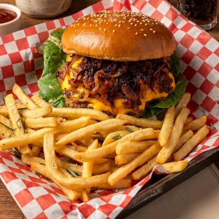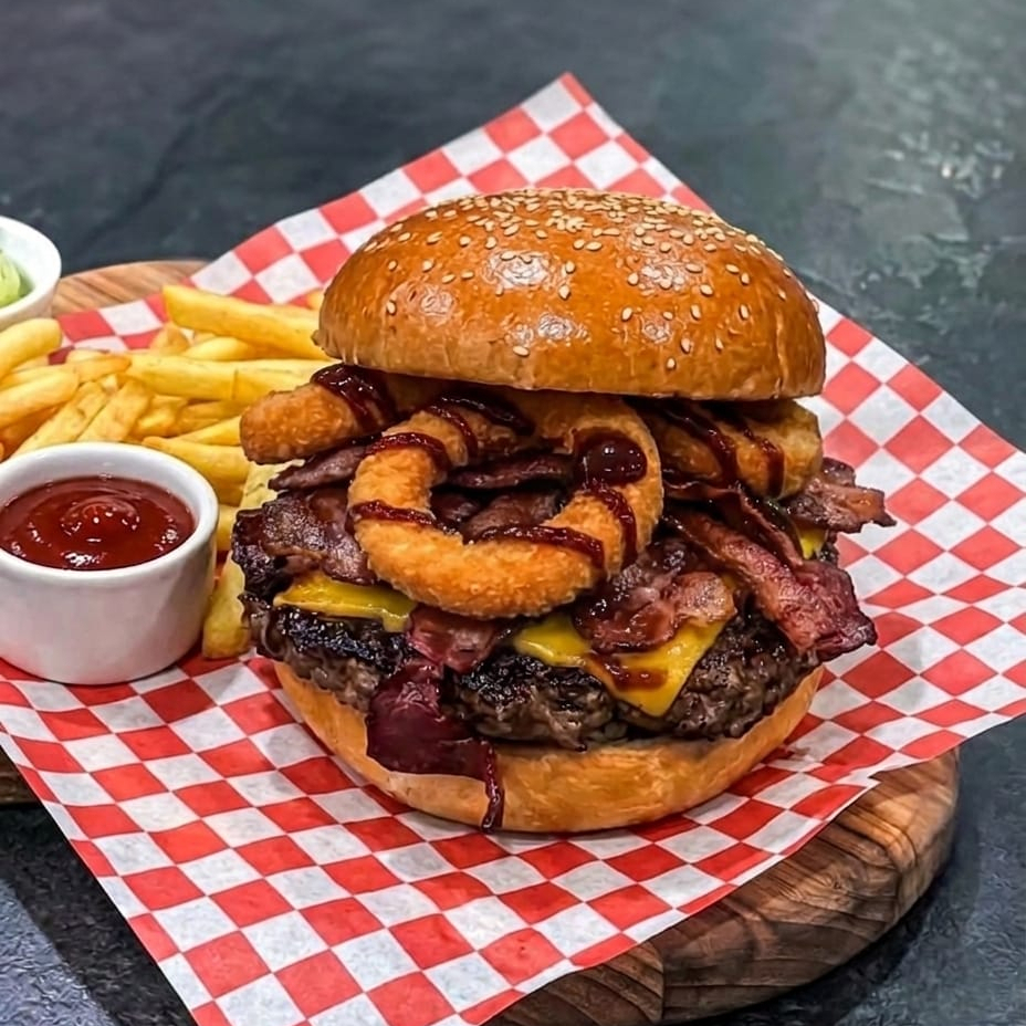 150gr Carne de res, queso cheddar, queso amarillo, tocino, aros de cebolla, salsa BBQ, lechuga, cebolla caramelizada.