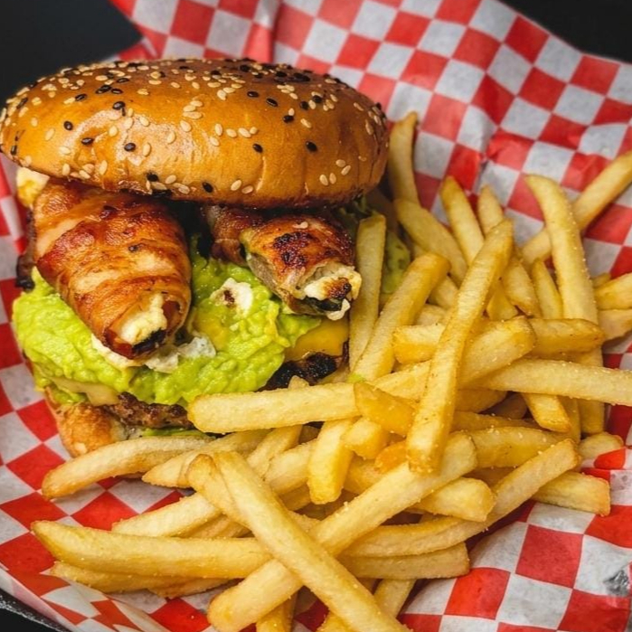 150gr Carne de res, queso amarillo, queso manchego, guacamole, 2 chiles rellenos envueltos de tocino.