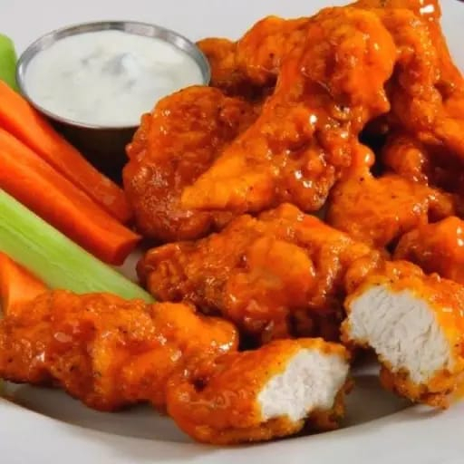 300 GR de boneless con salsa a escoger, Incluye aderezo ranch y guarnición de vegetales.