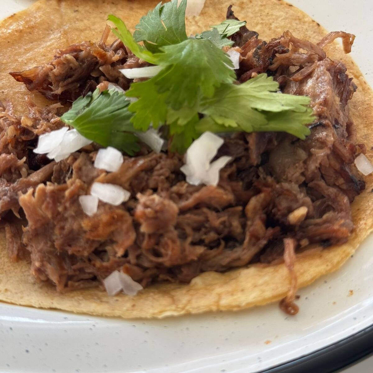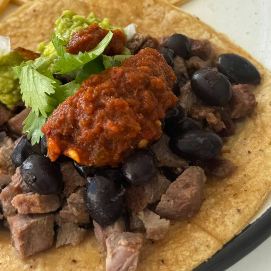 Carne jugosa con frijoles y guacamole en una tortilla de nixtamal