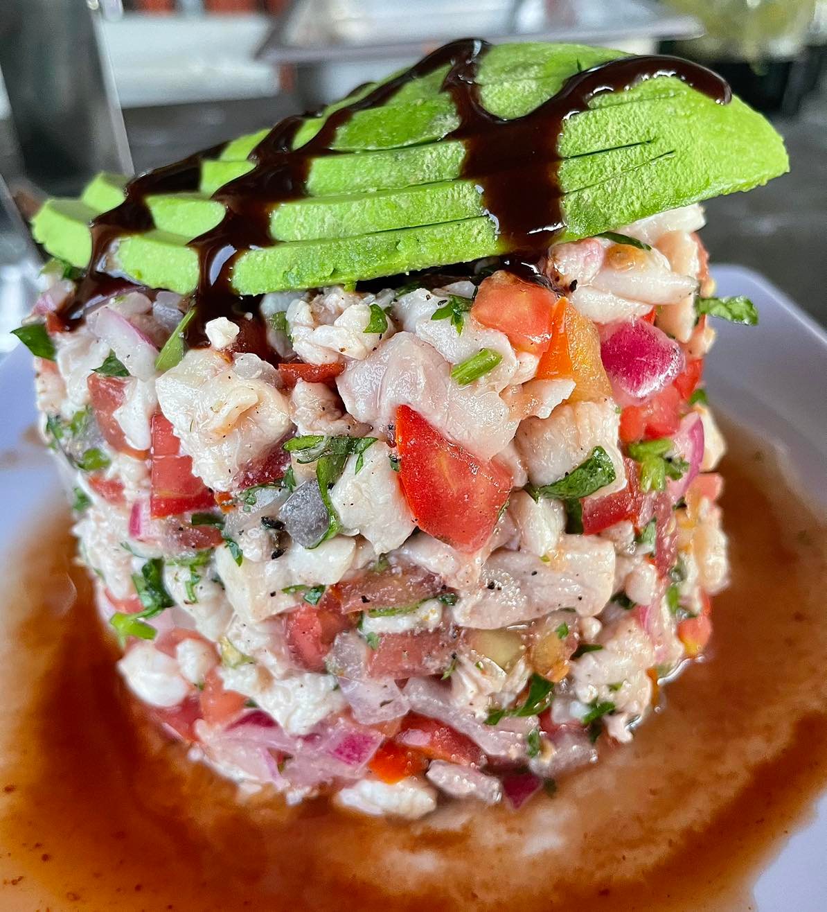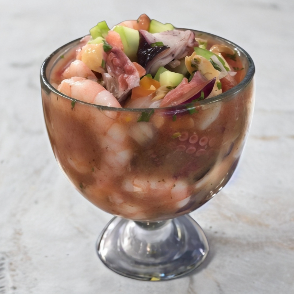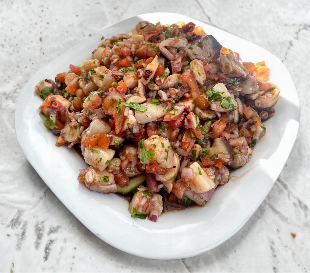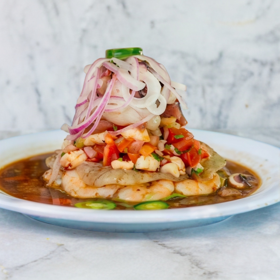Ceviche de pescado con camaron crudo y cocido, pulpo, callito y caracol en salsa de la casa