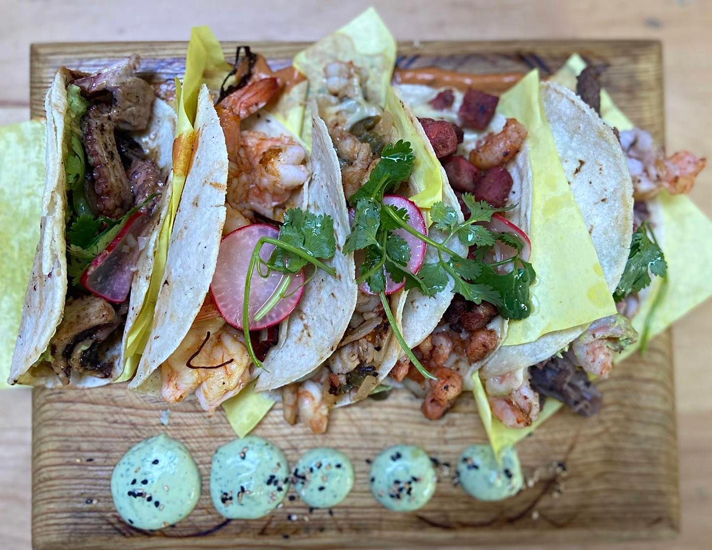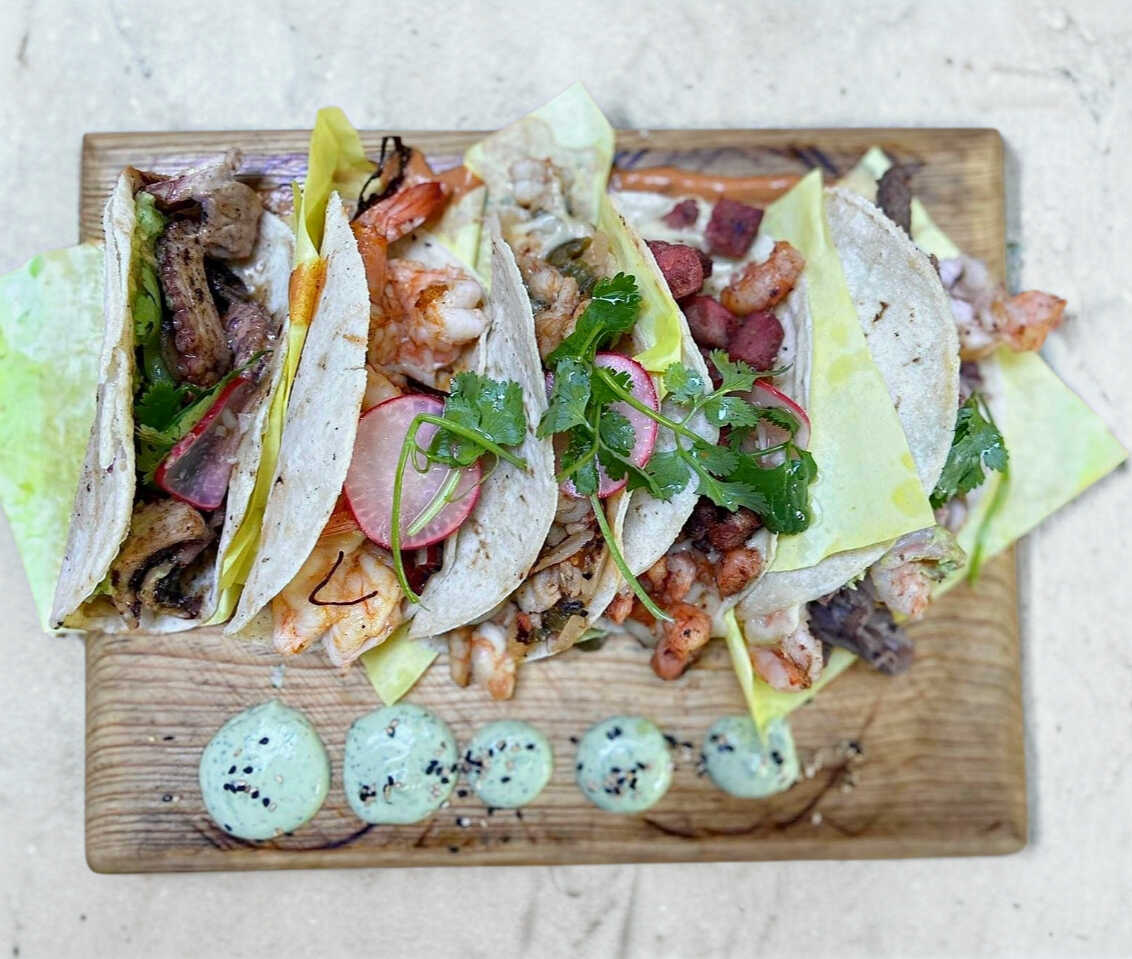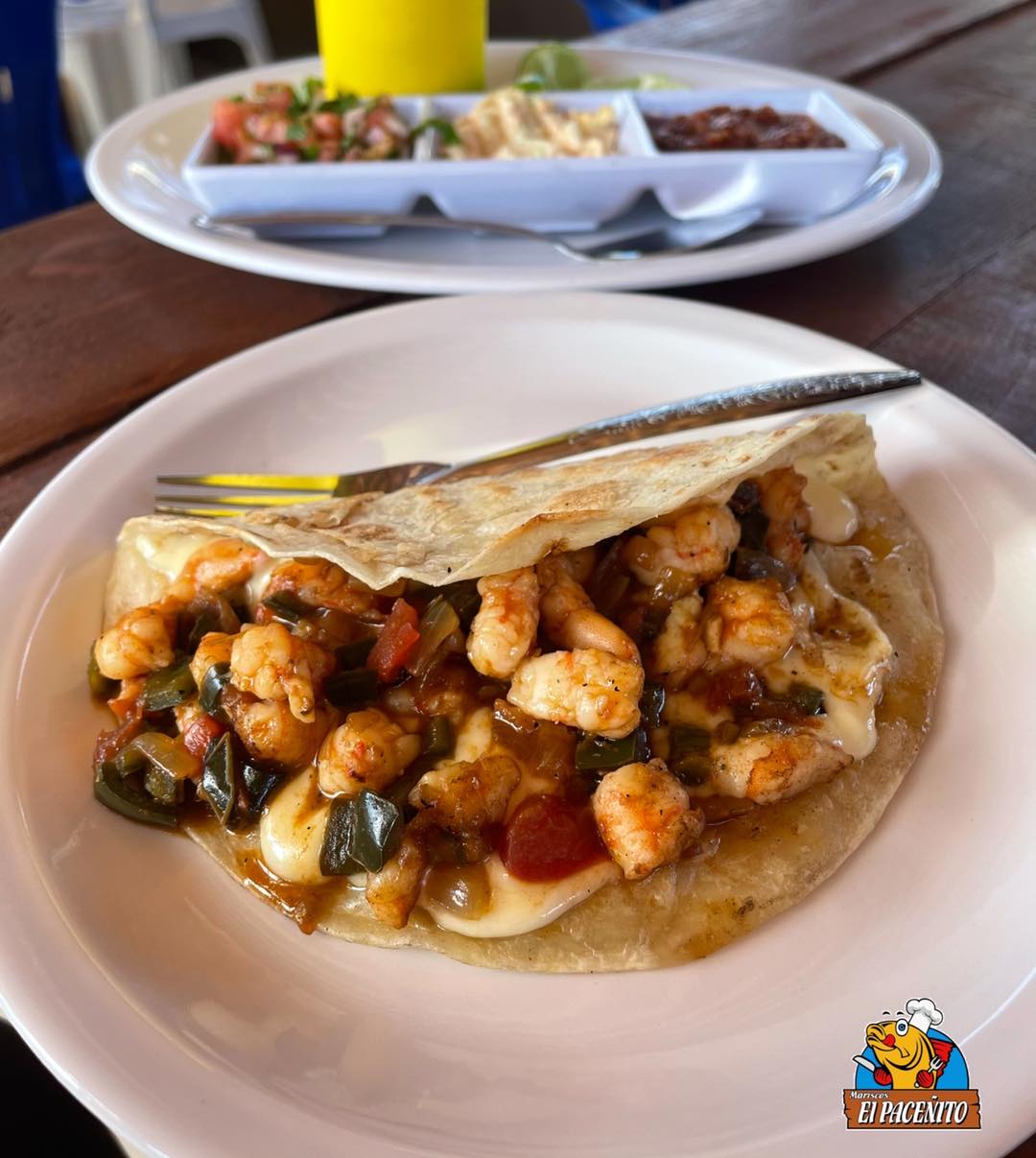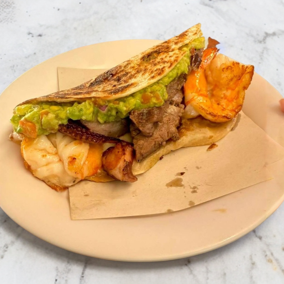 Tortilla de harina con queso, guacamole, pulpo, camarón y arrachera.