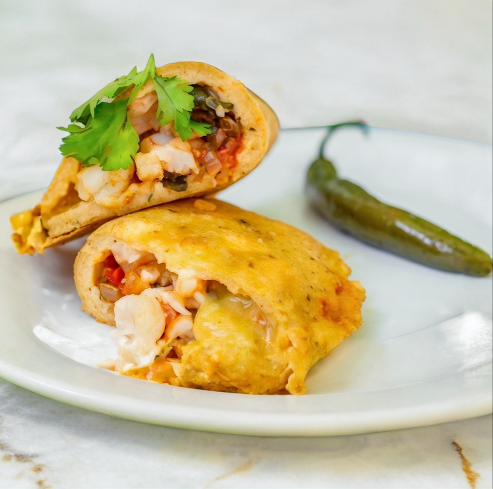 empanada de camaron con guiso de verdura y queso