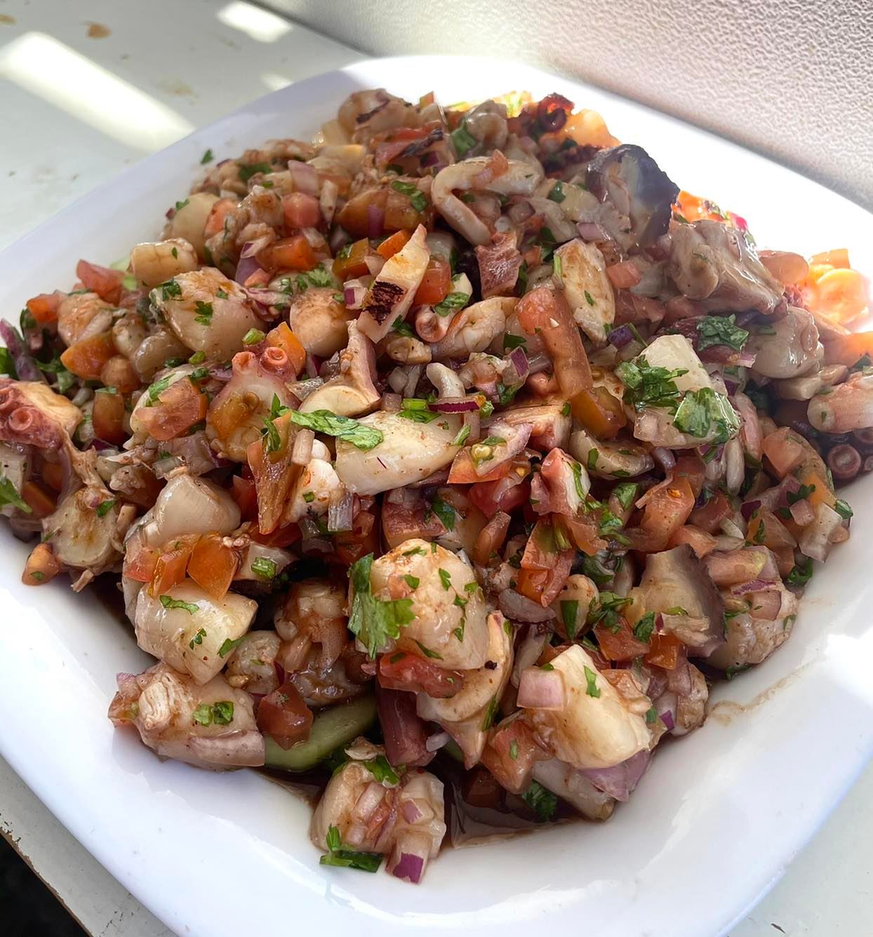 Camaron crudo y cocido, ceviche de pescado, catun callito y pulpo con un poco de chile serano y cebolla