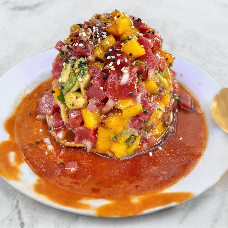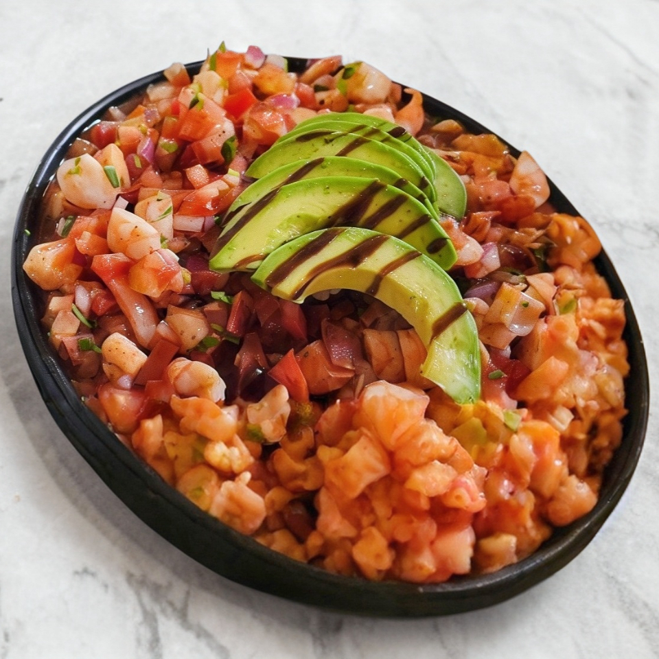 Ceviche de pescado con atún, mango, aguacate y una porción de mayonesa