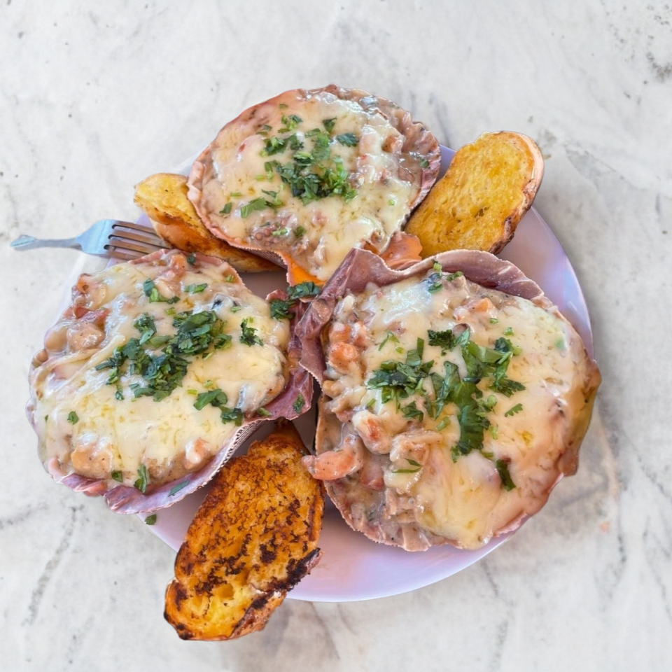 3 piezas de concha, marisco gratinado.