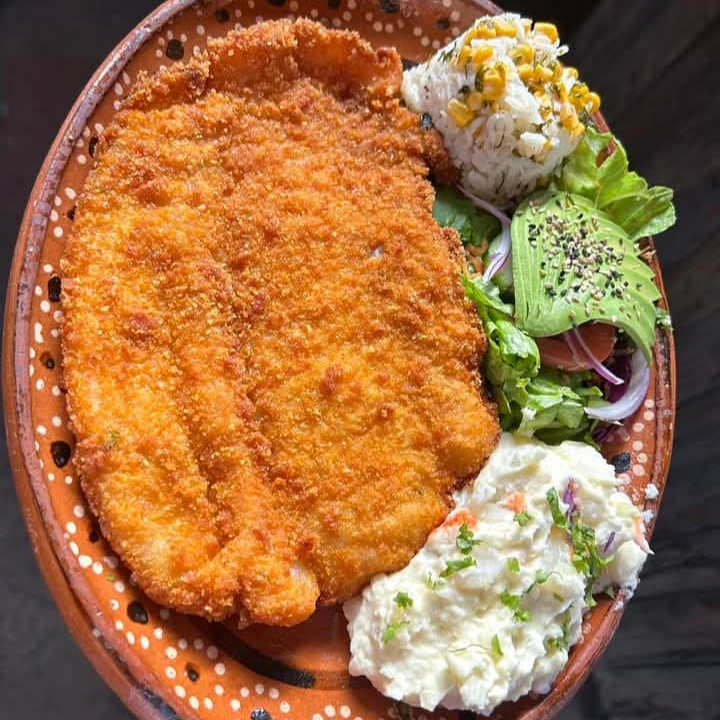 Filete relleno de 3 quesos y mariscos, ensalada de papa, ensalada verde y arroz