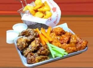 Bañados en tu salsa favorita incluye 2 guarniciones y ranch.