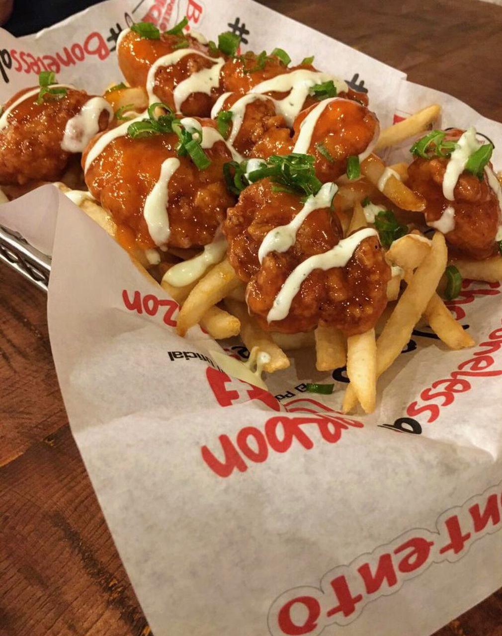 Papas fritas preparadas con boneless de pollo bañados en tu salsa favorita, cebollín fresco y un toque de ranch.