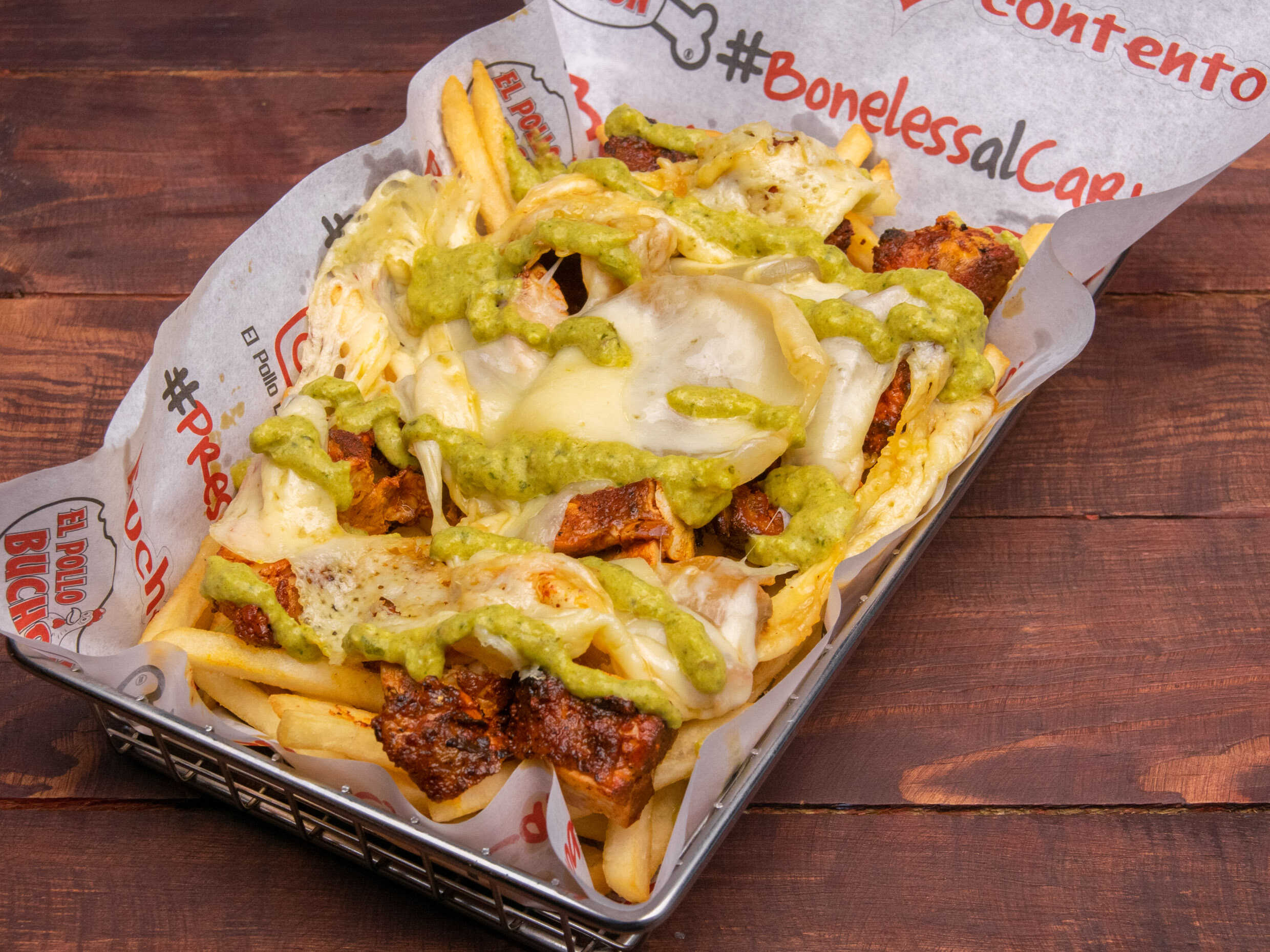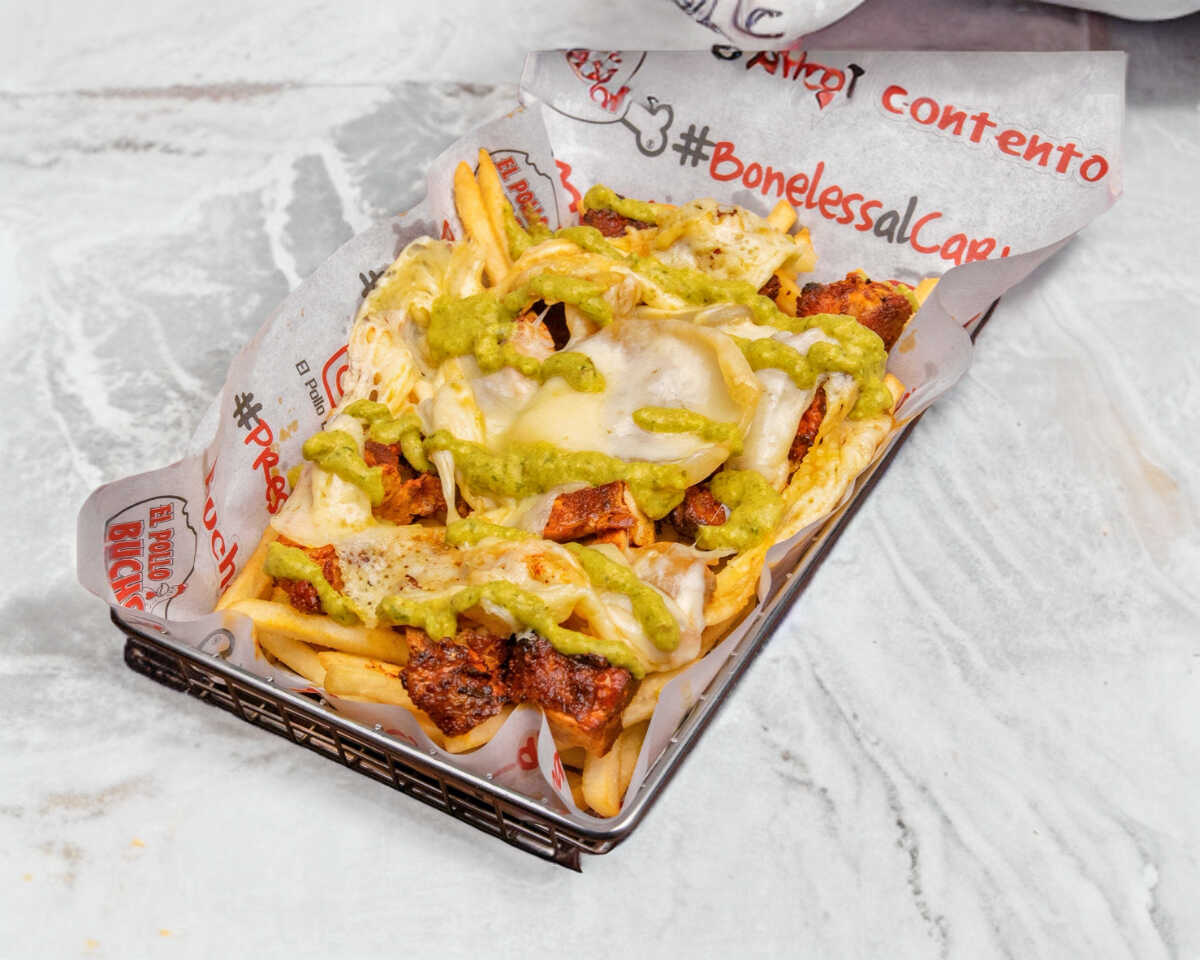 Papas fritas preparadas con boneless de pollo,queso nacho, tocino, jalapeños y un toque de cebollín.
