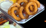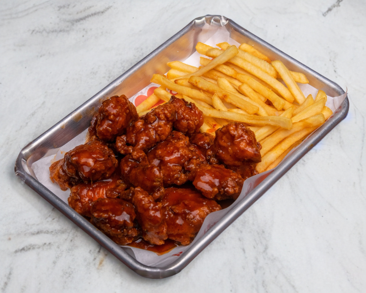 Boneless de pollo bañado en tu salsa favorita, aro de cebolla,tocino y un toque de ranch.