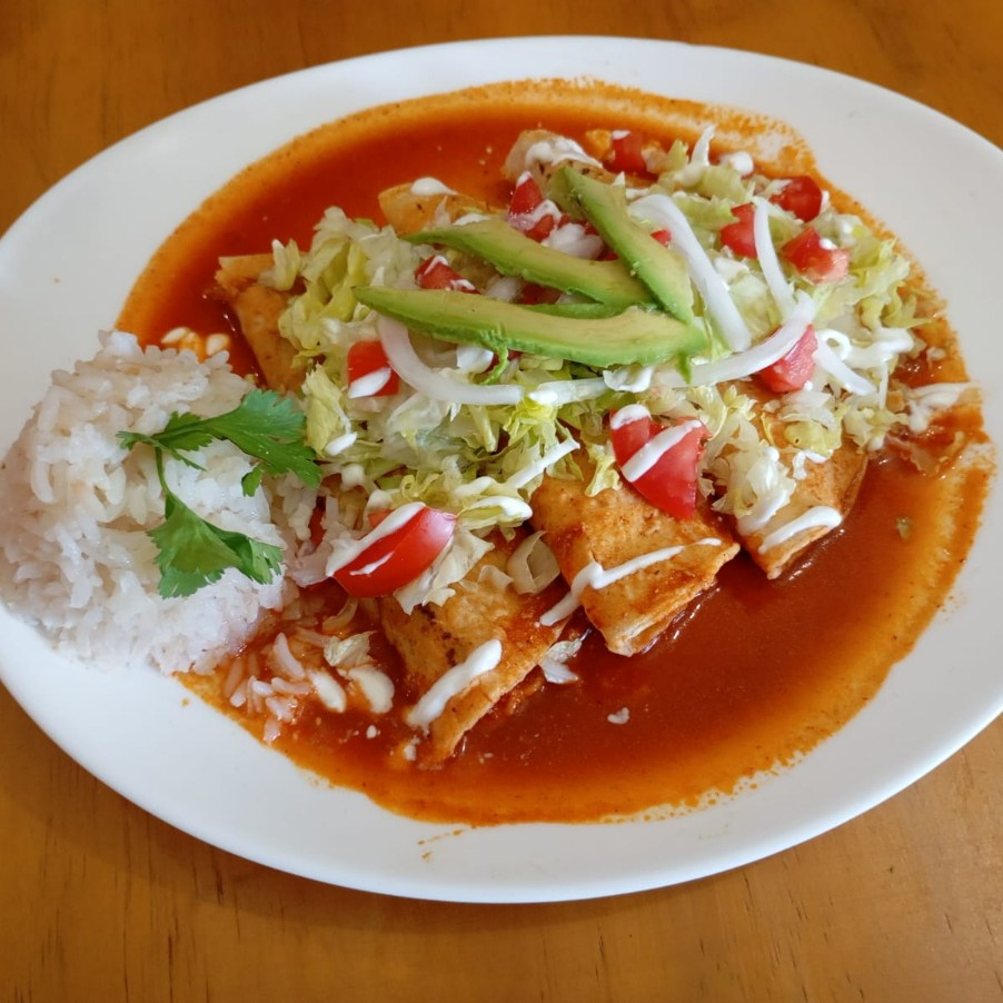Tortillas suavizadas en aceite (3) rellenas de pechuga de pollo desmenuzada, bañadas en salsa verde con crema, gratinadas con queso gouda, cebolla y un toque de ajonjolí. Acompañadas con arroz.