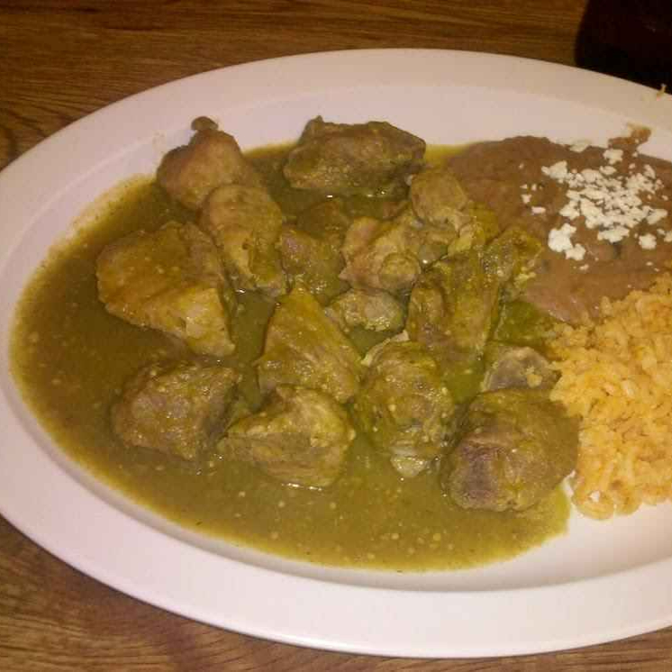 Chicharrón de cerdo en salsa verde de tomatillo fresco, incluye arroz frijol y tortillas.