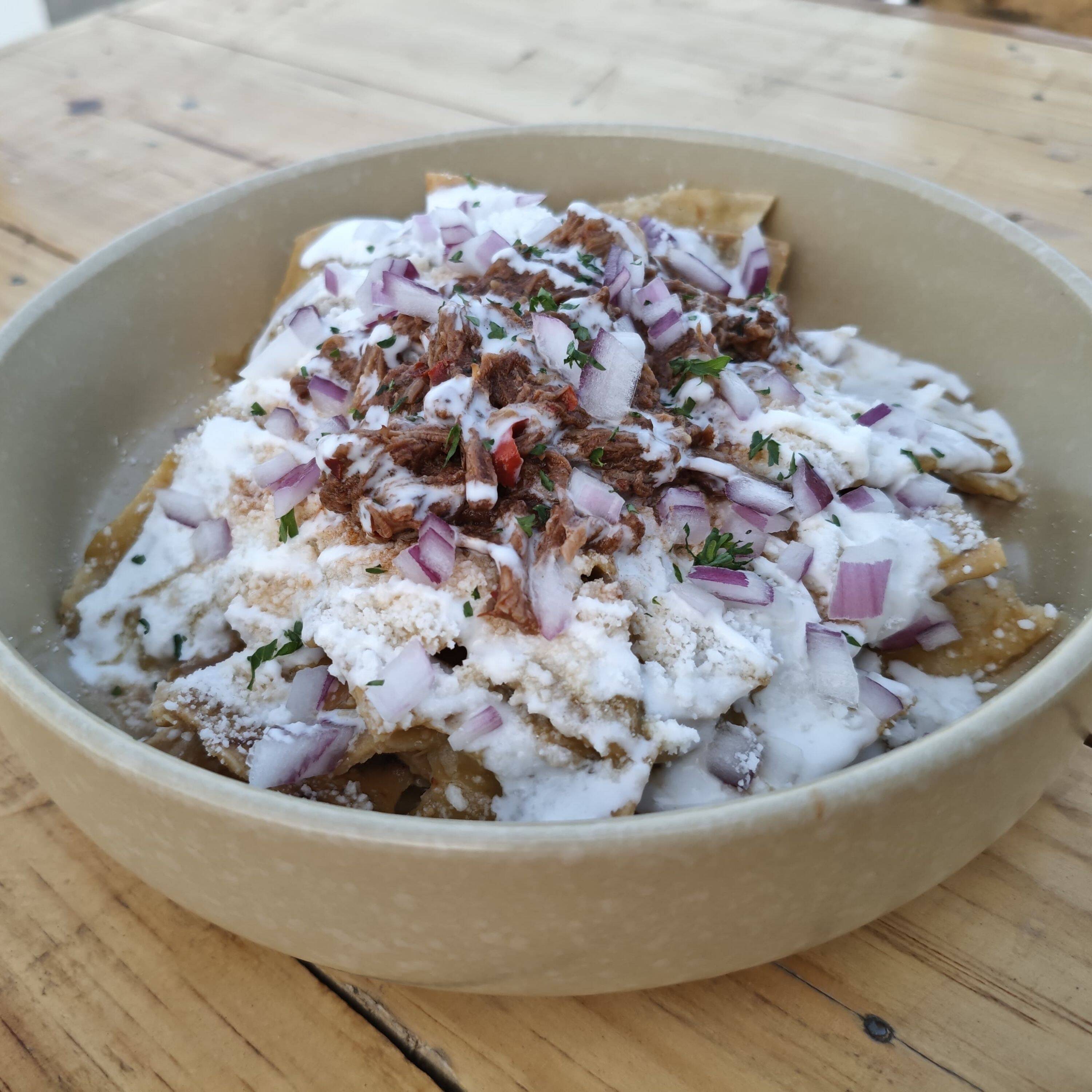 Chilaquiles con birria, crema, cebolla morada, queso espolvoreado y perejil para decorar
