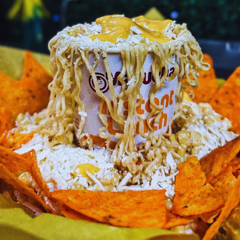Una cama de elote preparado con tus Sabritas favoritas, una Maruchan en el centro rellena de elote, todo decorado con nuestros aderezos y queso cotija… un antojo que manda en sabor.