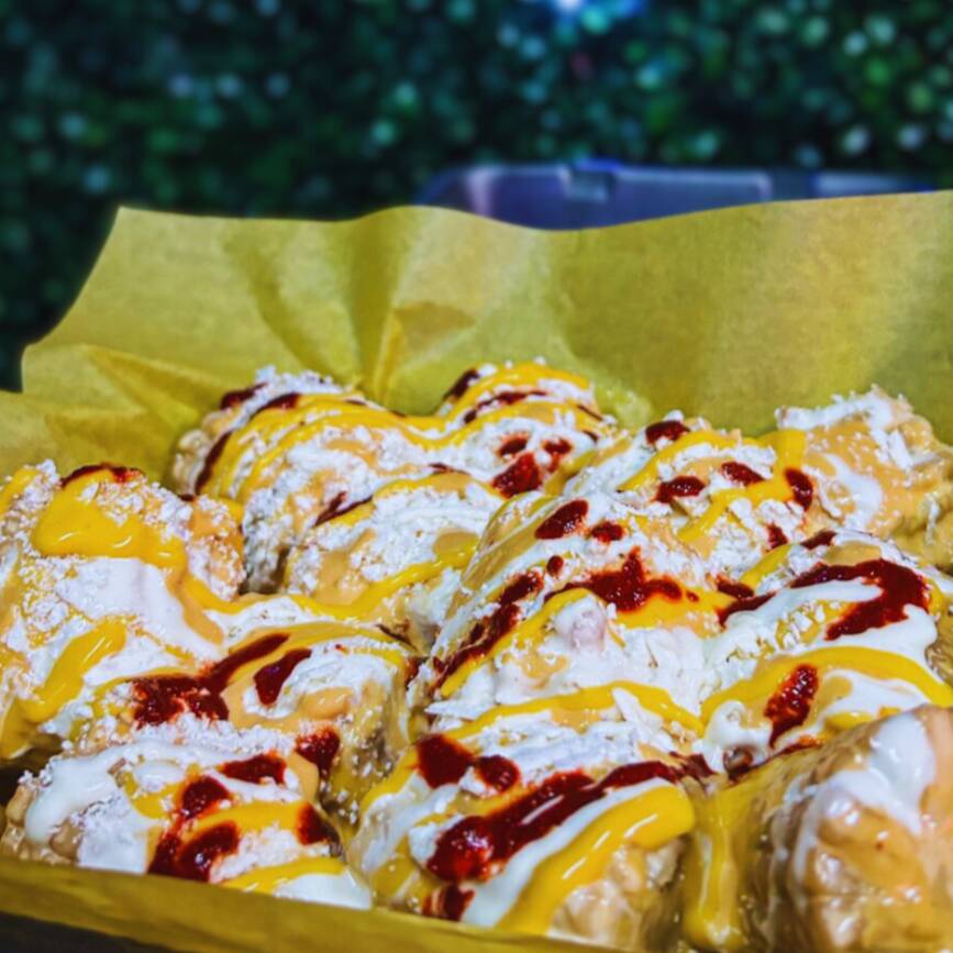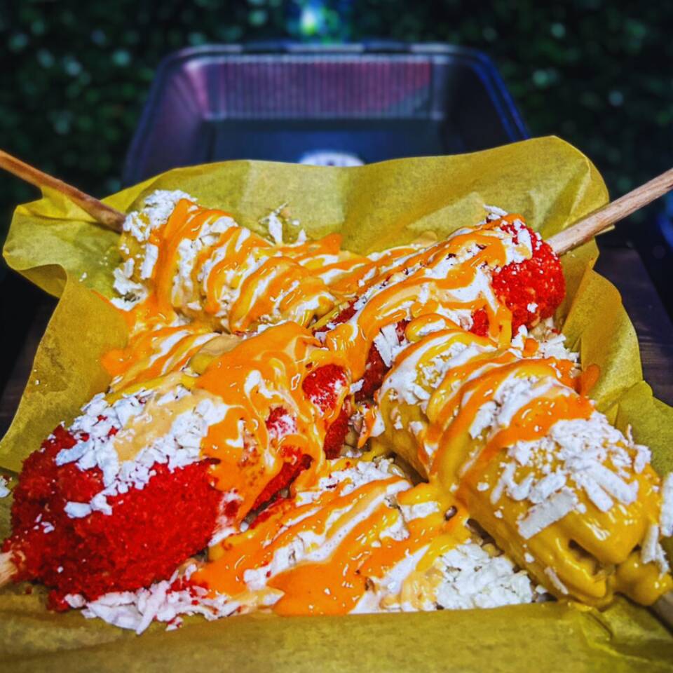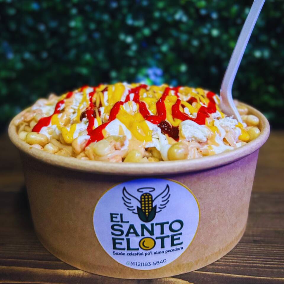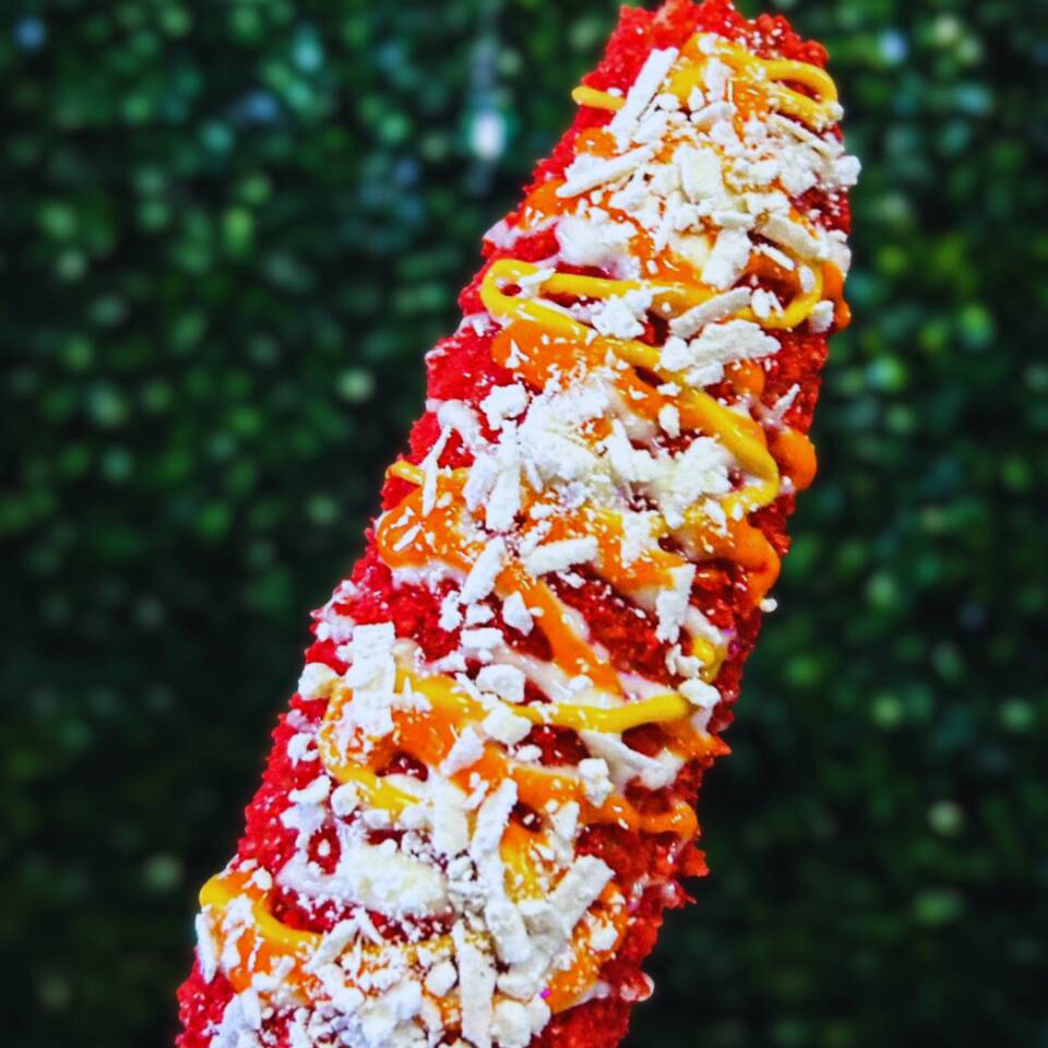 Elote entero bañado con nuestros benditos aderezos, empanizado con sabritas flaming hot, bañado en más de nuestros aderezos y espolvoreado con nuestro delicioso queso cotija
