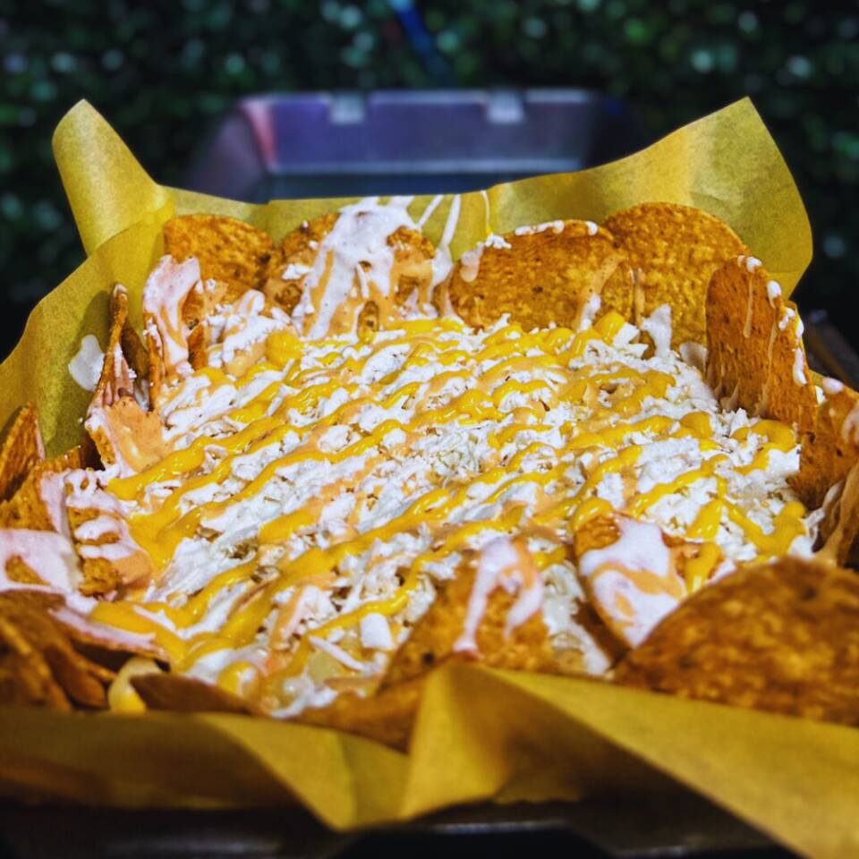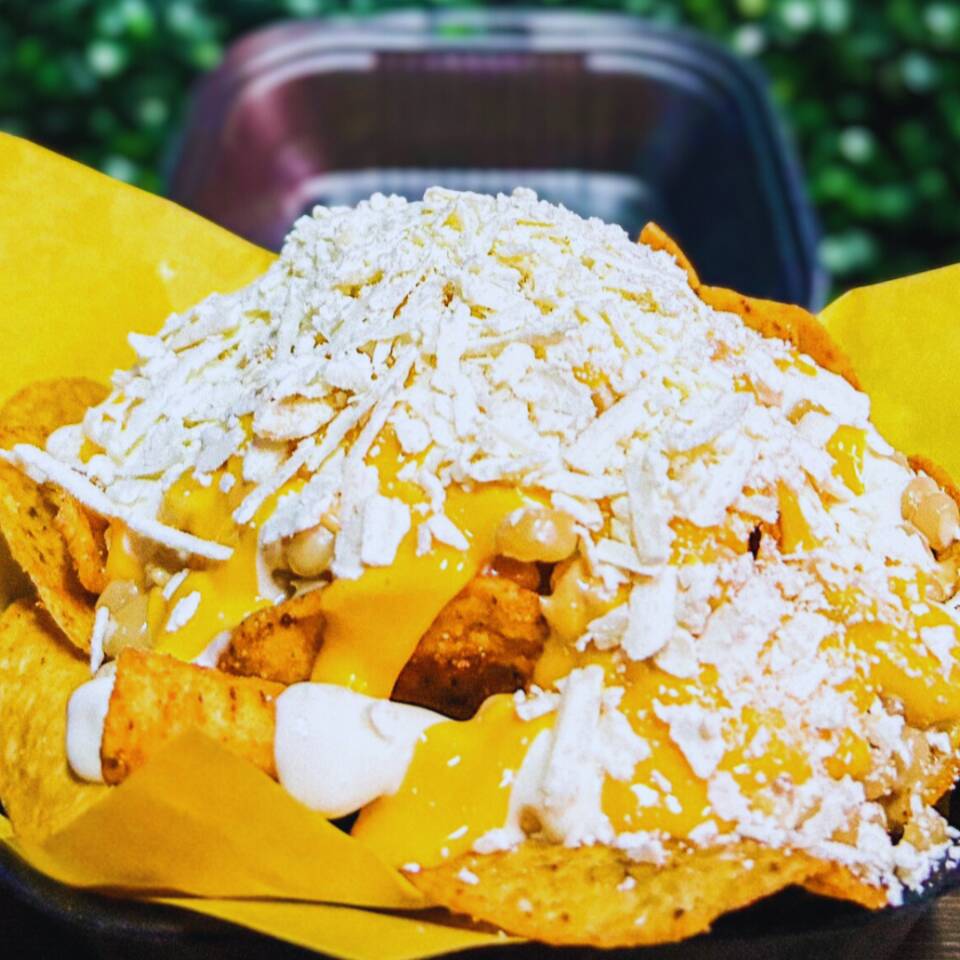 Totopos naturales bañados en queso amarillo derretido y nuestros aderezos benditos, espolvoreados con queso cotija y coronados con crujientes chiles jalapeños.