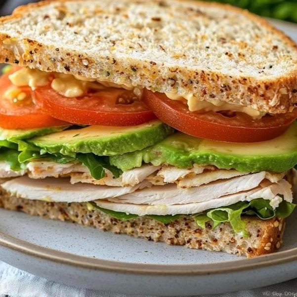 En pan multigrano con pechuga a la plancha, lechuga, tomate, pepino, aguacate y germinado